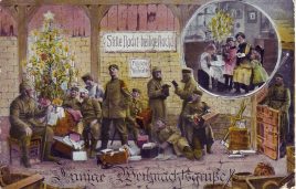 davanti al pianoforte e all’albero di Natale, una donna con la sua bambina, che stringe tra le mani quella che probabilmente è la sua unica bambola; più in alto, in una sorta di ideale vignetta che esce dalla mente della donna, l’immagine del padre, in divisa militare che rivolge lo sguardo verso casa. “Stille Nacht, helige Nacht, notte silenziosa e santa che risuona nei pensieri molto lontano, con tutto l’amore”, si legge sulla cartolina.