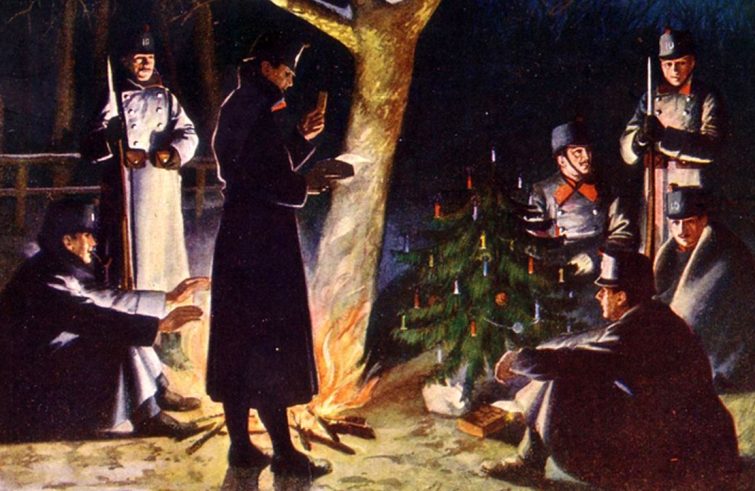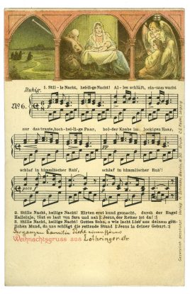 Il celebre canto natalizio accompagna le cartoline dal fronte. Una delle più antiche cartoline di Natale che riporta il testo di “Stille Nacht” è del 1895, mentre è datata 1897 la prima cartolina postale con testo e note della canzone. In alto, al centro di un trittico, si può ammirare la nascita di Gesù, di fronte al quale si fermano in preghiera due angeli (a destra), e verso il quale si dirigono i Magi guidati dalla stella (a sinistra). Nella parte inferiore trova spazio lo spartito con due strofe della canzone. Le parole di “Stille Nacht” sono arrivate fino al fronte e ritornano sulle cartoline postali tra il 1915 e il 1918, insieme alle raffigurazioni dei soldati impegnati al fronte o a quelli ricoverati negli ospedali militari, dove sono ritratti cantare insieme il celebre motivo natalizio, accompagnati al pianoforte da un’infermiera. Le cartoline ripropongono uno spaccato di quella che era la vita nelle famiglie al tempo della grande guerra, presentandola in una chiave più soft. Ecco che allora “Stille Nacht” ritorna su una cartolina sulla quale troviamo nel salotto di casa,