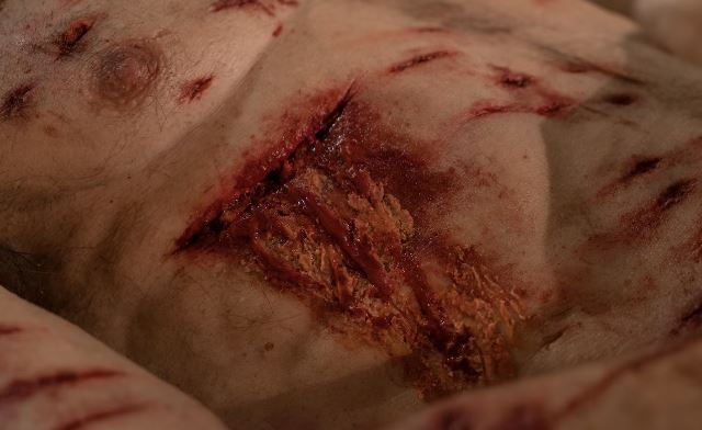 Sulla pelle si possono notare inoltre le ferite della flagellazione e le tracce delle unghie nelle mani e nei piedi, nonché la lacerazione tra la quinta e la sesta costola sul lato destro. Il naso è rotto e l’occhio destro contuso.