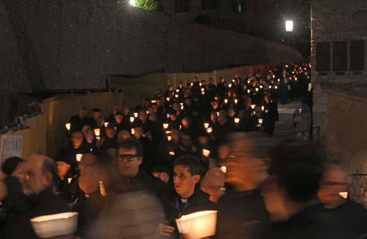 (da Assisi) Da Santa Chiara a San Francesco, nel cuore di Assisi, in processione con le fiaccole accese per implorare la pace in ogni angolo del mondo. È l’immagine-simbolo della 78ª Assemblea generale dei vescovi italiani, che ha conosciuto il suo momento culminante al termine della terza giornata di lavori. Prima i Vespri recitati nella basilica di Santa Chiara, poi la processione dei vescovi verso la Chiesa inferiore della basilica di San Francesco, per la celebrazione della Messa presieduta dal card. Matteo Zuppi, arcivescovo di Bologna e presidente della Cei, con la preghiera sulla tomba del santo. A guidare il Vespro e la processione è stato mons. Domenico Sorrentino, arcivescovo-vescovo di Assisi – Nocera Umbra – Gualdo Tadino e arcivescovo-vescovo di Foligno. “Il cuore di tutti noi – la preghiera prima della processione – è colmo di dolore per le guerre che lacerano il nostro tempo. Questa sera, unendoci all’anelito di pace che si innalza da tutti gli angoli della terra, ci mettiamo in cammino per sostare in preghiera presso la tomba di san Francesco, uomo di riconciliazione e fraternità. Affidandoci alla sua intercessione, supplichiamo Dio Padre, che in Cristo Gesù ha pacificato il cielo e la terra, di allontanare gli orrori della violenza e di donarci giorni di pace”. Un’invocazione, questa, che evoca la dichiarazione dei vescovi per la pace diffusa al termine della sessione mattutina di oggi, in cui i presuli riuniti in assemblea hanno espresso la loro