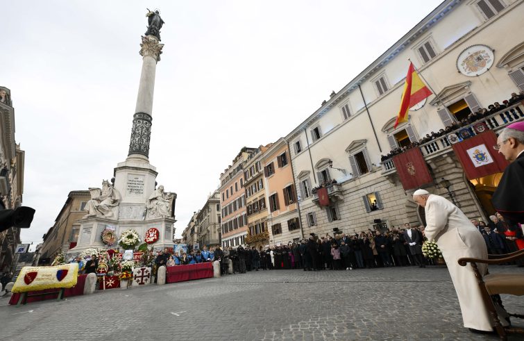 Il cuore “diviso tra speranza e angoscia”, lo sguardo al mondo insanguinato dalle guerre e alle donne vittime di violenza. Papa Francesco sosta in preghiera davanti alla statua della Vergine, in piazza di Spagna, ed eleva una supplica per la pace. Si è conclusa così la solennità dell’Immacolata, scandita quest’anno da tre momenti: l’Angelus in piazza San Pietro, dalla finestra dello studio del Palazzo apostolico, dove è tornato ad affacciarsi dopo due settimane a causa dell’infezione polmonare che l’ha colpito; la sosta in preghiera silenziosa a Santa Maria Maggiore, davanti all’icona della Madonna Salus Populi Roma alla quale ha reso omaggio con il dono della Rosa d’Oro, e infine il tradizionale omaggio all’Immacolata, per ribadire che “il male non ha la prima né l’ultima parola”.