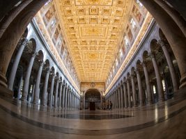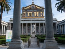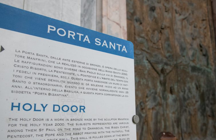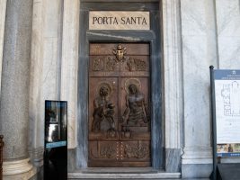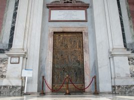 Vediamo insieme le diverse Porte Sante delle basiliche papali di Roma, cioè quelle che vengono smurate con un apposito rito solo prima dell’apertura del Giubileo e chiuse con mattoni e cemento al termine, partendo proprio da quella della basilica di San Pietro, che si trova all’estrema destra del portico. Quella attuale, realizzata dallo scultore Vico Consorti e donata dal popolo svizzero, è in bronzo ed è composta di 16 pannelli raffiguranti scene bibliche e giubilari. Sopra la porta si può leggere una scritta in latino “Patefeci, mihi, salutis ianuam, iustitiam ingressus sum, domino confitens” (Ho aperto la porta della salvezza; entrando nella giustizia, lodo il Signore).