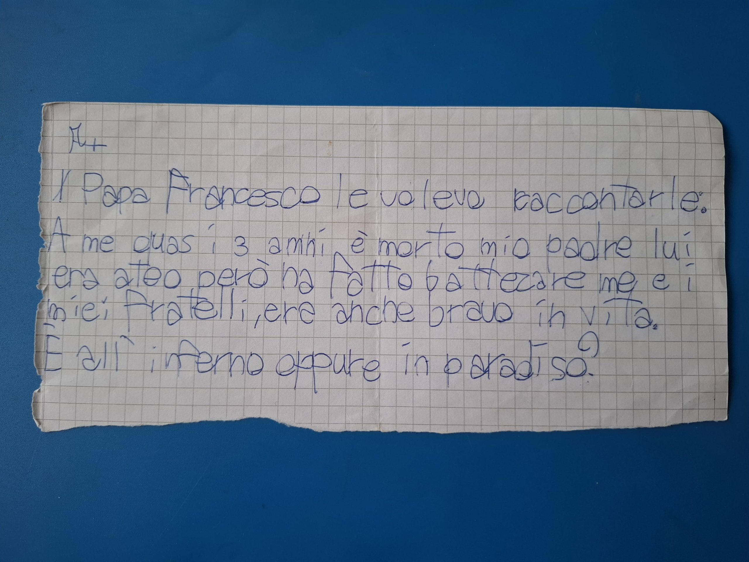 Torniamo a quel momento, il Papa arriva in parrocchia e al catechismo tutti i ragazzi sono invitati ad elaborare le domande da porgli. Tra queste ne vengono scelte quattro e la tua non poteva non essere presente. Al Papa hai chiesto: “Quasi tre anni fa è morto mio padre, lui era ateo però ha fatto battezzare me e i miei fratelli, era anche bravo in vita. È all’inferno oppure in paradiso?” Come è nata la tua domanda?