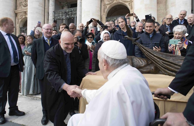 “Homeless Jesus” fu il primo incontro tra una mia scultura e il Santo Padre, dieci anni fa, con la prima raffigurazione di Gesù come senzatetto. All’epoca la crisi dei senza dimora non era così drammatica. Ma Francesco comprese subito la forza di quell’immagine. La sua benedizione diede forza al messaggio. E oggi, quel messaggio è ancora più necessario di allora.