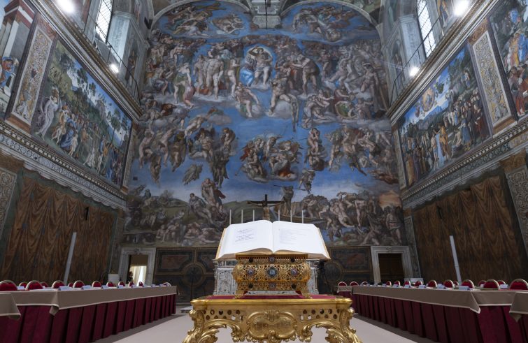 Gli arredi. In occasione del Conclave, la Cappella è arredata con sedie di ciliegio, contrassegnate dal nome e cognome di ciascun cardinale Elettore, e tavoli di legno grezzo, coperti da un panno beige e satin bordeaux, disposti su due file di diverso livello. Davanti all’altare, sotto il Giudizio Universale di Michelangelo, un tavolo per l’urna di legno grezzo dove saranno raccolte le schede con i voti, e un leggio con il Vangelo sul quale i porporati prestano giuramento.