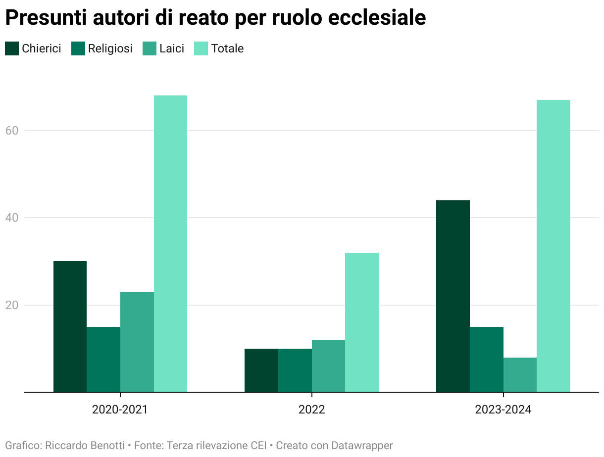 I dati dei Centri di ascolto restituiscono un altro elemento chiave: le persone si stanno avvicinando, chiedono ascolto, accompagnamento, verità. Nel 2024 sono stati segnalati 69 casi di presunto abuso, in parte relativi al passato e in parte recenti. A essi sono associati 67 presunti autori: 44 chierici, 15 religiosi e 8 laici. La maggior parte delle segnalazioni riguarda l’ambito parrocchiale (27 casi).
