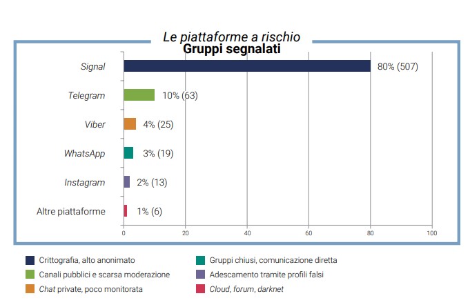 Da inizio anno segnalati 507 gruppi Signal. Dopo aver monitorato Telegram, Signal e Viber, Meter ha in particolare denunciato Signal, app preferita da adescatori e pedofili dal momento che la crittografia end-to-end utilizzata la conferma come primo ed estremo baluardo della privacy, impossibilitando qualsiasi azione di contrasto al fenomeno. In questo modo è possibile produrre e smerciare materiale pedopornografico in maniera pressoché indisturbata:
