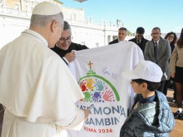 Al termine dell’Udienza generale della settimana scorsa si è vissuto un momento di forte emozione: il piccolo Majd Bernard, 7 anni, originario di Gaza ha consegnato a Papa Leone XIV la bandiera con il logo ufficiale della Giornata Mondiale del Bambino (Gmb) 2026.