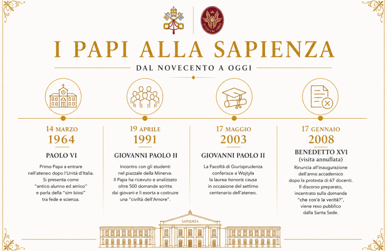 Quella ferita ha segnato per anni il dibattito pubblico italiano sul rapporto tra fede e laicità. Papa Francesco non ha effettuato visite ufficiali al campus, ma nel maggio 2022 ha ricevuto Polimeni richiamando il “rapporto nativo” tra la Chiesa e l’istituzione universitaria. Ora la visita di Leone XIV si inserisce in questo solco. Il programma prevede l’arrivo alle 10.20 nella cappella “Divina Sapienza”, il saluto agli studenti dalla scalinata monumentale, la firma del Libro d’Onore e il discorso ufficiale alle 11.30 nell’Aula Magna. Una giornata che, sette secoli dopo la bolla di Bonifacio VIII, ricorda come il vescovo di Roma e il mondo della cultura possano ancora interrogarsi insieme sul futuro della famiglia umana.