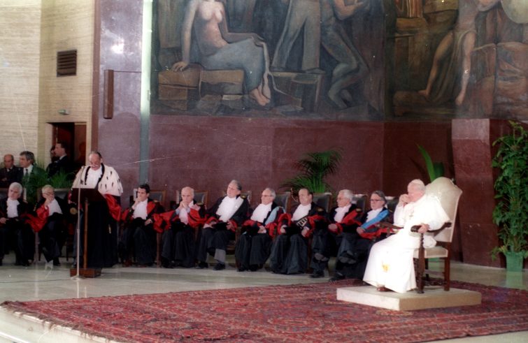 Il riconoscimento più solenne arrivò il 17 maggio 2003, quando la Facoltà di Giurisprudenza conferì a Wojtyła la laurea honoris causa per il settimo centenario dell’ateneo. Tornando alla vicenda del 2008, il pretesto della contestazione era una citazione del 1990 in cui Ratzinger aveva richiamato Paul Feyerabend sul processo a Galileo, in realtà per illustrare la crisi della ragione moderna.