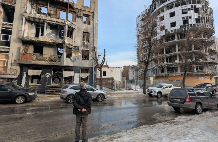Kharkiv, davanti a palazzi distrutti dai missili (Foto Taizé)