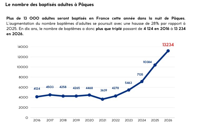 Tra gennaio e marzo 2026 è stato condotto un sondaggio in Francia su 1.450 catecumeni provenienti da 60 diocesi. Alla domanda “Qual è stato l’evento scatenante della tua richiesta di battesimo?”, il 40% ha risposto di aver “vissuto un evento difficile (malattia, lutto, ecc.) che mi ha spinto a cercare un significato”; un 34% di aver posto delle “domande sulla religione cristiana” ed un 32% lega la scelta ad “una forte esperienza spirituale vissuta”. C’è anche un 23% che ha risposto di essere “entrato in un luogo significativo e di essere rimasto colpito dalla sua bellezza” come luoghi di arte e centri di spiritualità.