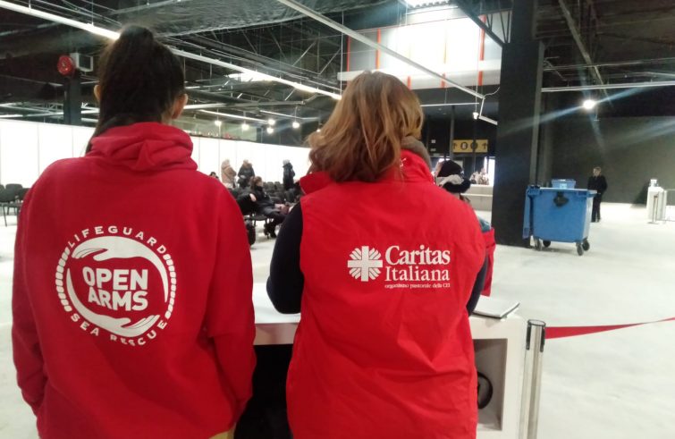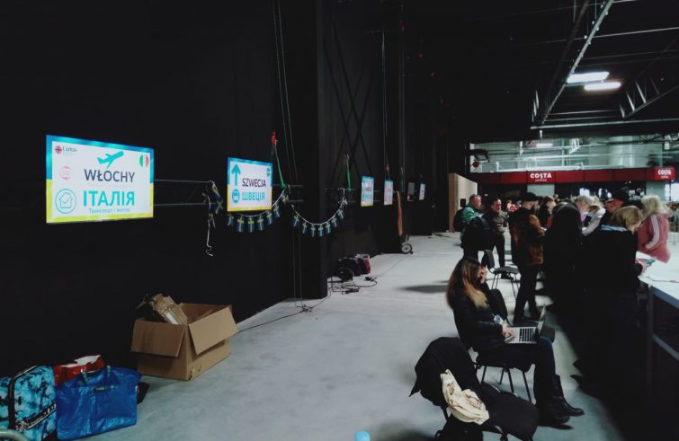 La meta per la salvezza. Sugli schermi veniva indicato il Paese di destinazione, le persone sceglievano così la meta per la salvezza. Caritas italiana, insieme ad Open Arms e Solidaire, ha preparato dei volantini con il disegno di un aereo, la bandiera dell’Ucraina e dell’Italia, e una casa, per far capire che sarebbe stato fornito alloggio presso le Caritas diocesane. Con brevi spiegazioni in inglese e ucraino su modalità delle partenze e su cosa sarebbe successo in Italia. Le persone che sceglievano l’Italia venivano identificate con un braccialetto, dopo il controllo dei documenti grazie alla collaborazione dell’ambasciata italiana in Polonia e dell’ambasciata ucraina.
