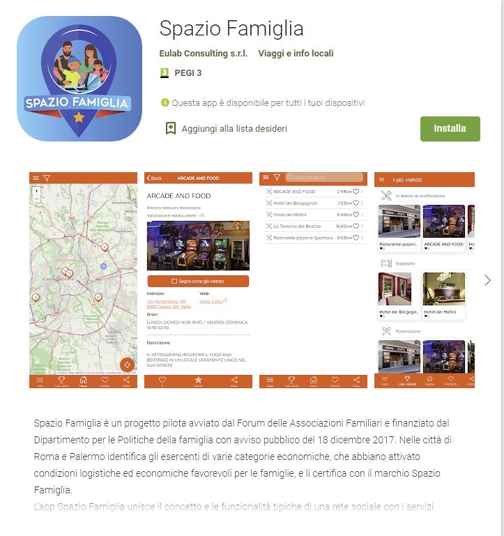 Un TripAdvisor a misura di famiglia per trovare ristoranti, alberghi, luoghi di cultura e ricreativi, esercizi commerciali “family e child friendly”. È l’app “Spazio Famiglia”, stesso nome del progetto pilota del Forum delle associazioni familiari, finanziato dalla Presidenza del Consiglio dei Ministri – Dipartimento per le politiche della Famiglia, che prevede una sperimentazione localizzata nelle città di Roma e Palermo, presentata mercoledì 25 maggio in Campidoglio. L’app si può scaricare da Playstore e da Apple Store ed è consultabile anche la piattaforma on line.
