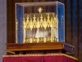 La pregiata urna artistica, in ottone dorato con saldature in argento ed interni in velluto rosso, creata per la pubblica venerazione dei Beati Coniugi Luigi e Maria Beltrame Quattrocchi contiene le seguenti Reliquie: