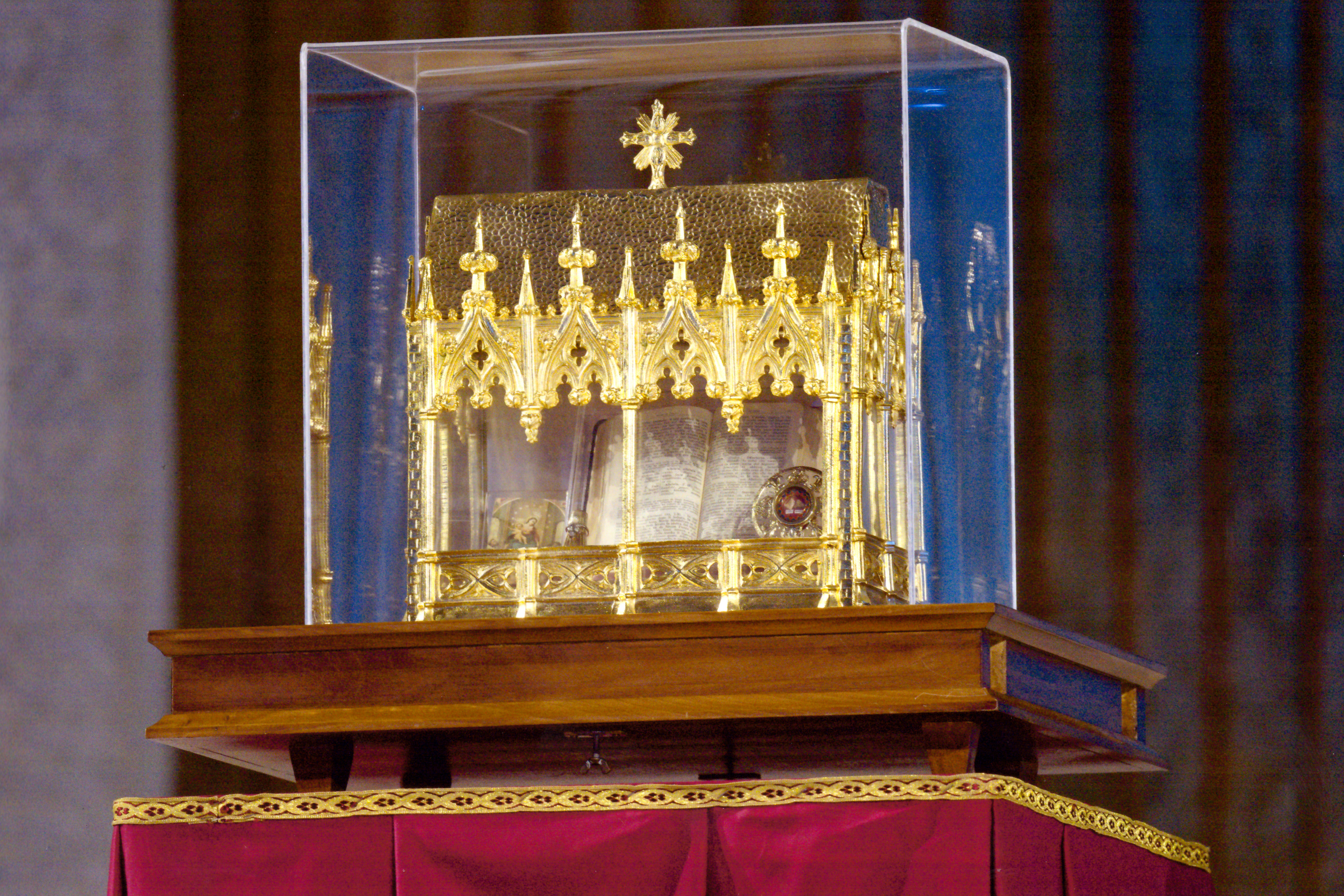La pregiata urna artistica, in ottone dorato con saldature in argento ed interni in velluto rosso, creata per la pubblica venerazione dei Beati Coniugi Luigi e Maria Beltrame Quattrocchi contiene le seguenti Reliquie: