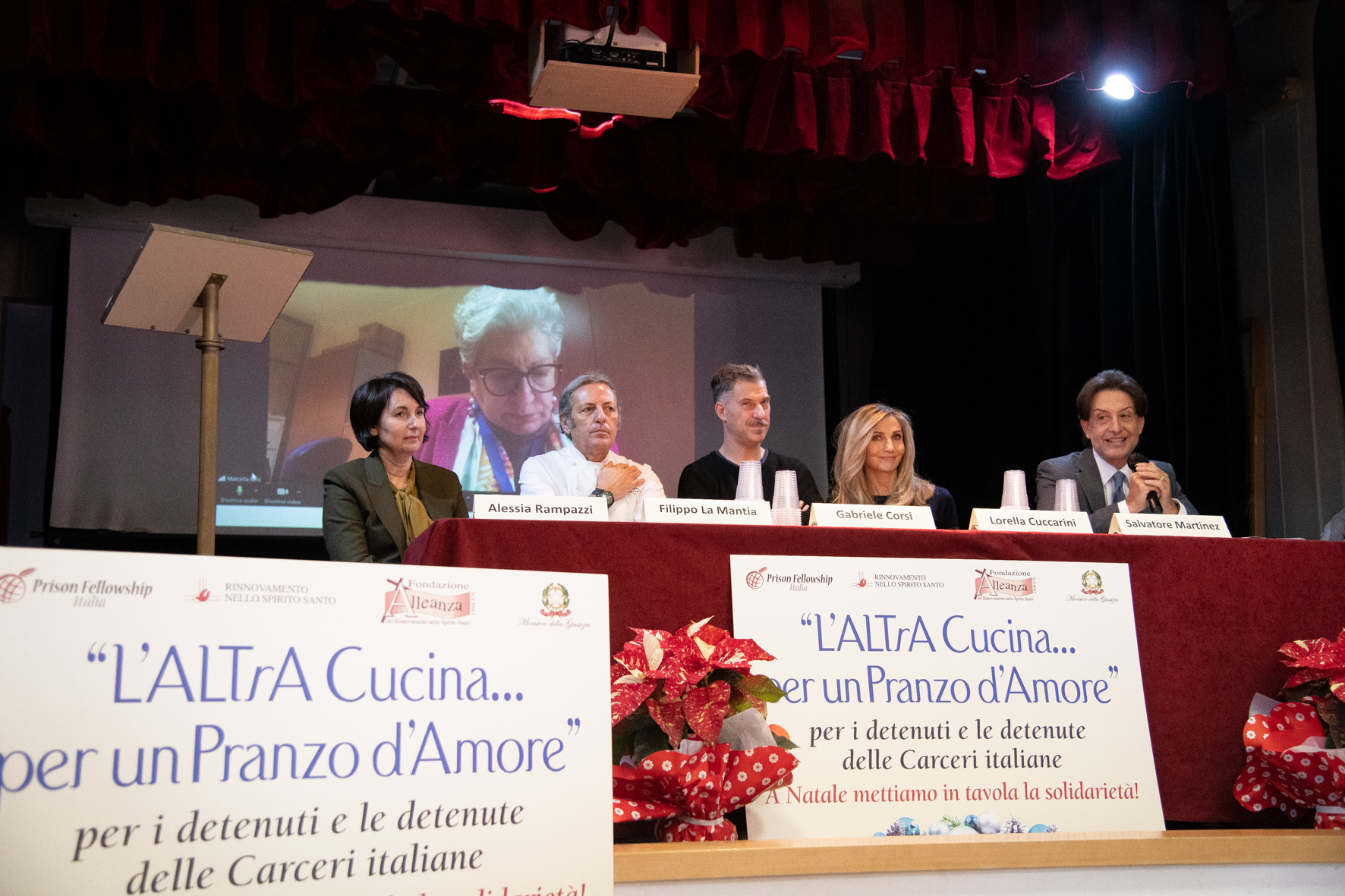 Sono state le parole dette ieri da Salvatore Martinez, presidente di Rns, che ha vissuto il pranzo assieme alle 230 detenute della Casa circondariale femminile di Rebibbia a Roma, con i piatti preparati dallo chef Filippo La Mantia e serviti da Antonio Giuliani, Massimo Mattia, Lorella Cuccarini, Gabriele Corsi e Laura Pertici, Stefano Jurgens, Ottavia Pojaghi Bettoni, Valeria Fabrizi, Maria Grazia Schiavo, Giulia Fiume, Kim Rossi Stuart, Ilaria Spada e Beatrice Fazi. “È stato difficilissimo ma siamo felicissimi, perché parlano i numeri: più di 600 volontari, 6mila pasti da preparare, 25 chef”, ha dichiarato Marcella Reni, presidente di Prison Fellowship Italia, che ha spiegato come questo sia soltanto “la ciliegina sulla torta” di un impegno che dura tutto l’anno, come ad esempio il progetto di giustizia riparativa “Sicomoro” che serve per far incontrare detenuti e vittime di reati in un percorso di riconciliazione e riparazione, ma anche “Genitori dentro e fuori” che serve per rieducare ad un corretto rapporto di genitorialità.