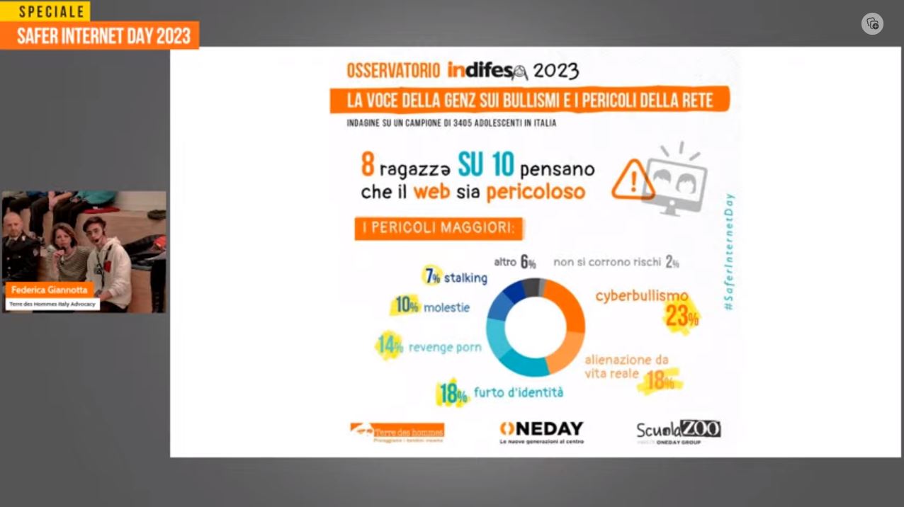 “Con l’Osservatorio indifesa raccogliamo le opinioni e l’esperienza dei ragazzi sui temi del bullismo, cyberbullismo e violenza di genere. E come quest’anno, dal 2014 il nostro compito è quello di ampliare la voce dei ragazzi e delle ragazze e portarla all’attenzione dell’opinione pubblica e delle istituzioni politiche, per far sì che vengano ascoltati e che siano loro ad ispirare un vero cambiamento. Oggi quello che chiediamo insieme e per i ragazzi e le ragazze è un cambiamento verso una maggior protezione degli adolescenti quando sono online”, ha affermato Federica Giannotta, responsabile Advocacy di Terre des Hommes. L’organizzazione ha anche presentato lo scorso maggio una proposta di riforma legislativa per rendere il web un ambiente più protetto. In occasione del Safer Internet Day Terre des Hommes ha chiesto ai ragazzi e alle ragazze di firmare e condividere la petizione lanciata a sostegno di questa proposta di riforma. Giannotta ha spiegato i punti cruciali della proposta di riforma legislativa: “Agevolare, da subito, la comunicazione con le piattaforme per i processi di segnalazione, con eventuale rimozione di contenuti illeciti. Rendere effettivamente perseguibile l’autore del reato, anche mediante la sua identificazione. Individuare, anche per i reati commessi via social, il luogo di attuazione della condotta illecita. Istituire un’Autorità garante dei diritti degli utenti della rete e di protezione dei minori”.