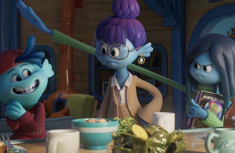 (from left) Sam Gillman (Blue Chapman), Agatha Gillman (Toni Collette) and Ruby Gillman (Lana Condor) in DreamWorks Animation’s Ruby Gillman, Teenage Kraken, directed by Kirk DeMicco.