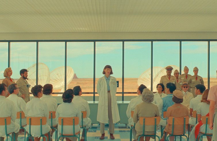 Punto di forza del genio di Wes Anderson è il racconto della realtà, della società americana (ma non solo), ricorrendo al sogno, alla favola eclettica e raffinata, persino all’animazione. La sua messa in scena è puntualmente magnifica, elegante e seducente. I suoi film rimangono impressi nella mente soprattutto per la composizione visiva, per un cromatismo sofisticato, unico, che domina persino sul racconto. A esaltare il tutto le musiche di Alexandre Desplat, compositore che lo segue stabilmente ormai da anni (da “Fantastic Mr. Fox”, 2009). Questo è valido anche per “Asteroid City”, film giocato in tre atti ed epilogo che corre su un binario composto da turchese, giallo e arancione, non tralasciando il sofisticato bianco e nero che rimanda al mondo del palcoscenico, all’artificio creativo.