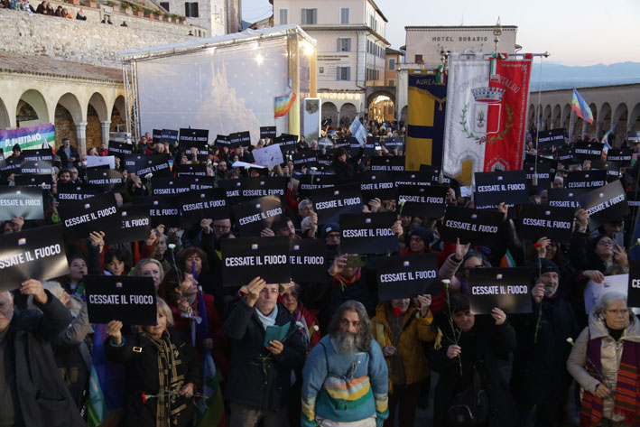 della sofferenza di chi trova muri insormontabili sulla via del cessate il fuoco, in Ucraina, a Gaza e in decine di altri angoli del mondo. Alla “bandiera arcobaleno” che traccia il percorso si affiancano e seguono decine e decine di cartelli: tanti sono neri come la guerra e la distruzione e riportano la scritta “cessate il fuoco”. Sia alla partenza sia all’arrivo del corteo, si susseguono gli appelli perché le armi possano fermarsi. Tra questi, ci sono anche le parole accorate di padre Ibrahim Faltas, vicario della Custodia francescana di Terra Santa. Da settimane ripete, a ogni occasione, che il momento attuale è il più drammatico negli ultimi decenni, peggiore pure dell’assedio alla basilica della Natività del 2002, che lui ha vissuto in prima persona.