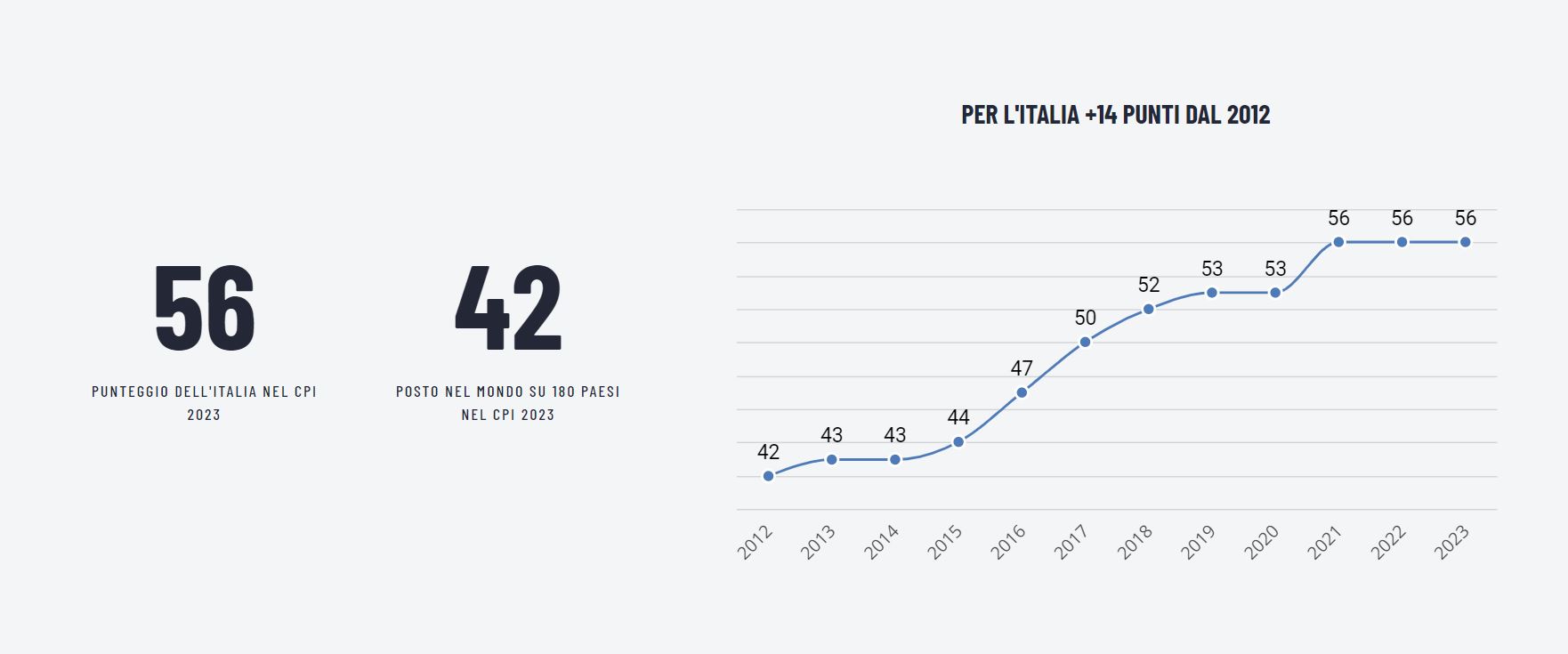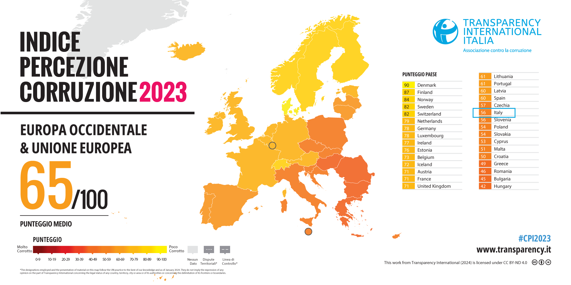 Il Cpi 2023 conferma il punteggio di 56 per l’Italia e colloca il nostro Paese al 42° posto nella classifica globale dei 180 Paesi oggetto della misurazione. “Il consolidamento del punteggio del nostro Paese nel Cpi 2023 conferma l’Italia nel gruppo dei Paesi europei più impegnati sul fronte della trasparenza e del contrasto alla corruzione. Un risultato che è anche frutto dell’applicazione di alcune misure normative adottate in materia di whistleblowing e di appalti pubblici”, commenta Michele Calleri, presidente di Transparency International Italia. “In un tempo in cui le guerre e gli altri conflitti internazionali si incancreniscono, pregiudicando i commerci e le normali migrazioni, qualcuno potrebbe pensare che, allora, la corruzione sia tollerabile e che i controlli possano attenuarsi, ma sbaglia – osserva Calleri -. La corruzione nuoce all’economia e mortifica l’integrità delle persone, in ogni epoca e in ogni contesto. Occorre che la politica e i governi mantengano in cima alla loro agenda i temi della trasparenza e della lotta alla corruzione”. In Italia, ad oggi, rimangono aperte alcune questioni che continuano ad incidere negativamente sulla capacità del nostro sistema di prevenzione della corruzione nel settore pubblico. Dalle carenze normative che regolano il tema del conflitto di interessi nei rapporti tra pubblico e privato, alla mancanza di una disciplina in materia di lobbying e alla recente sospensione del registro dei titolari effettivi che potrebbe limitare gli sforzi dell’antiriciclaggio.