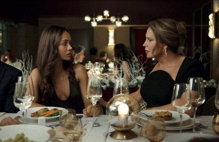 Emilia Pérez. (Featured L-R) Zoe Saldaña as Rita Moro Castro and Karla Sofía Gascón as Emilia Pérez in Emilia Pérez. Cr. Netflix © 2024.