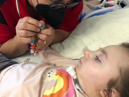I progetti all’inizio erano concentrati sul bambino in ospedale. Come la “collana del coraggio”: il bambino riceve un filo con una stella su cui è scritto il suo nome e un corallino speciale per ogni procedura medica cui viene sottoposto, per ogni tappa raggiunta e per il tempo trascorso in ospedale, così da creare una collana piena di colori, segno tangibile della sua forza e del suo coraggio. Con questo progetto aiutiamo i bambini ad affrontare la sofferenza e lo stress della malattia. La collana può servire al bambino per raccontare la sua esperienza durante il ricovero e dopo, favorendo così la presa di coscienza del vissuto mentale ed emotivo che accompagna qualsiasi intervento sul corpo. La collana è importante anche per i genitori che vedono riconosciuti la forza e il coraggio che hanno nell’accompagnare il figlio attraverso la malattia e il suo percorso di cura. Abbiamo realizzato anche gli “Orsetti” che possono essere attaccati al ventilatore. Grazie ad una donazione di Ikea, abbiamo regalato ai bambini in ospedale coprisensori a forma di pupazzetto per i saturimetri che monitorano i parametri vitali ma che hanno una lucina rossa che a volte dà fastidio ai bambini, com’è successo una sera a Carol.
