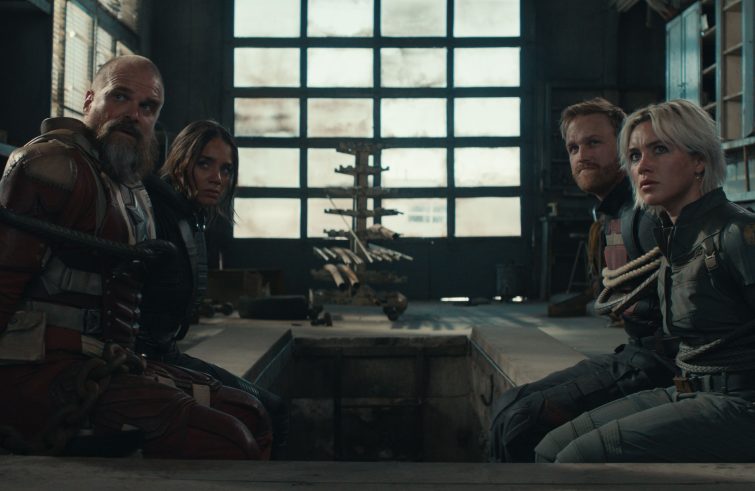 L-R): Alexei Shostakov/Red Guardian (David Harbour), Ghost (Hannah John-Kamen), John Walker (Wyatt Russell) and Yelena Belova (Florence Pugh) in Marvel Studios’ THUNDERBOLTS*. Photo courtesy of Marvel Studios. © 2025 MARVEL.