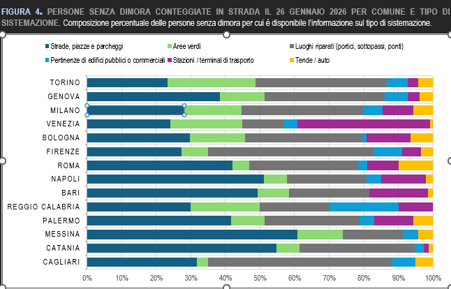 L’Italia si scopre più fragile davanti ai numeri della grave emarginazione adulta. Sono almeno 10.037 le persone senza fissa dimora sopra i 18 anni rilevate nei 14 comuni delle aree metropolitane del Paese nel gennaio 2026. Di questi, 5.563 persone (55,4%) sono ospitate nelle strutture di accoglienza notturna e 4.474 persone (44,6%) vivono in strada, in spazi pubblici privi di riparo, spesso nei centri storici, dove ci si arrangia con giacigli di fortuna. Nelle strutture di accoglienza notturna le persone di nazionalità straniera sono oltre i due terzi del totale (3.838 contro 1.725 di nazionalità italiana) e, anche tra chi è stato rilevato in strada, rappresentano il 70,5 per cento dei casi con nazionalità individuata. Sono i principali dati che emergono dalla Rilevazione delle persone senza dimora, compiuta dall’Istat su richiesta della fio.PSD (Federazione italiana Organismi per le persone senza dimora), che per la prima volta ha abbandonato le stime basate sull’uso dei servizi mensa per passare a un conteggio diretto sul campo, coinvolgendo oltre 6.000 volontari in 14 città metropolitane.