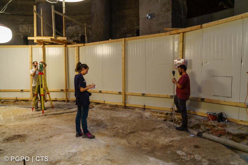 Proseguono senza sosta i lavori di scavo e di restauro della pavimentazione della basilica del Santo Sepolcro a Gerusalemme. Il flusso dei pellegrini in fila per entrare nel cuore della Cristianità è ordinato e silenzioso e non disturba il cantiere archeologico organizzato dall’équipe interdisciplinare di archeologi e studiosi della Università di Roma La Sapienza guidata dalla professoressa Francesca Romana Stasolla (Dipartimento di Studi sul Mondo antico). Qualche pellegrino prova a guardare oltre le recinzioni che delimitano il cantiere ma senza esito. L’accesso è negato e anche scattare foto è proibito.