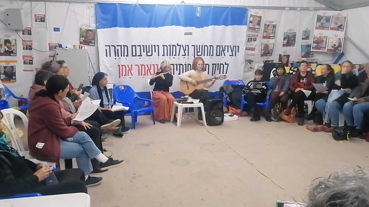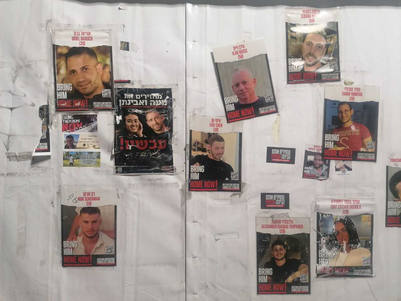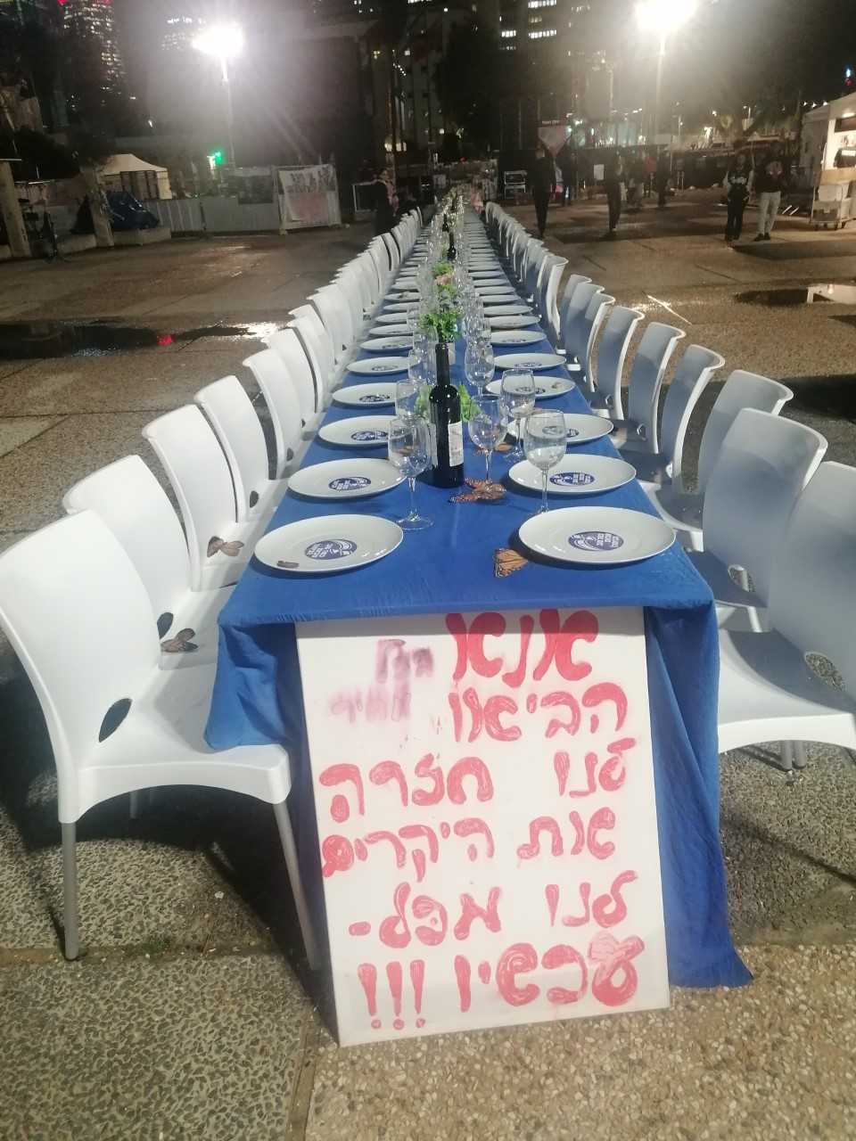 “Riportiamoli a casa adesso” (Bring them home now!) è anche lo slogan che si legge inciso, in inglese e ebraico, nelle piastrine militari indossate al collo dalle famiglie degli ostaggi e che campeggia su striscioni e manifesti appesi in quella che tutti a Tel Aviv conoscono con il nome di Piazza degli Ostaggi. Un megaschermo situato proprio all’ingresso della piazza conta giorni, ore, minuti e secondi della prigionia degli ostaggi. Dentro un grande tendone gruppi di persone cantano e pregano di continuo per la loro liberazione. E per non dimenticarli, in mezzo alla piazza è stata anche allestita una lunga tavola apparecchiata, da un lato con piatti, posate bicchieri e fiori e dall’altro con resti di cibo e acqua sporca per indicare le drammatiche condizioni in cui versano nei tunnel di Gaza.