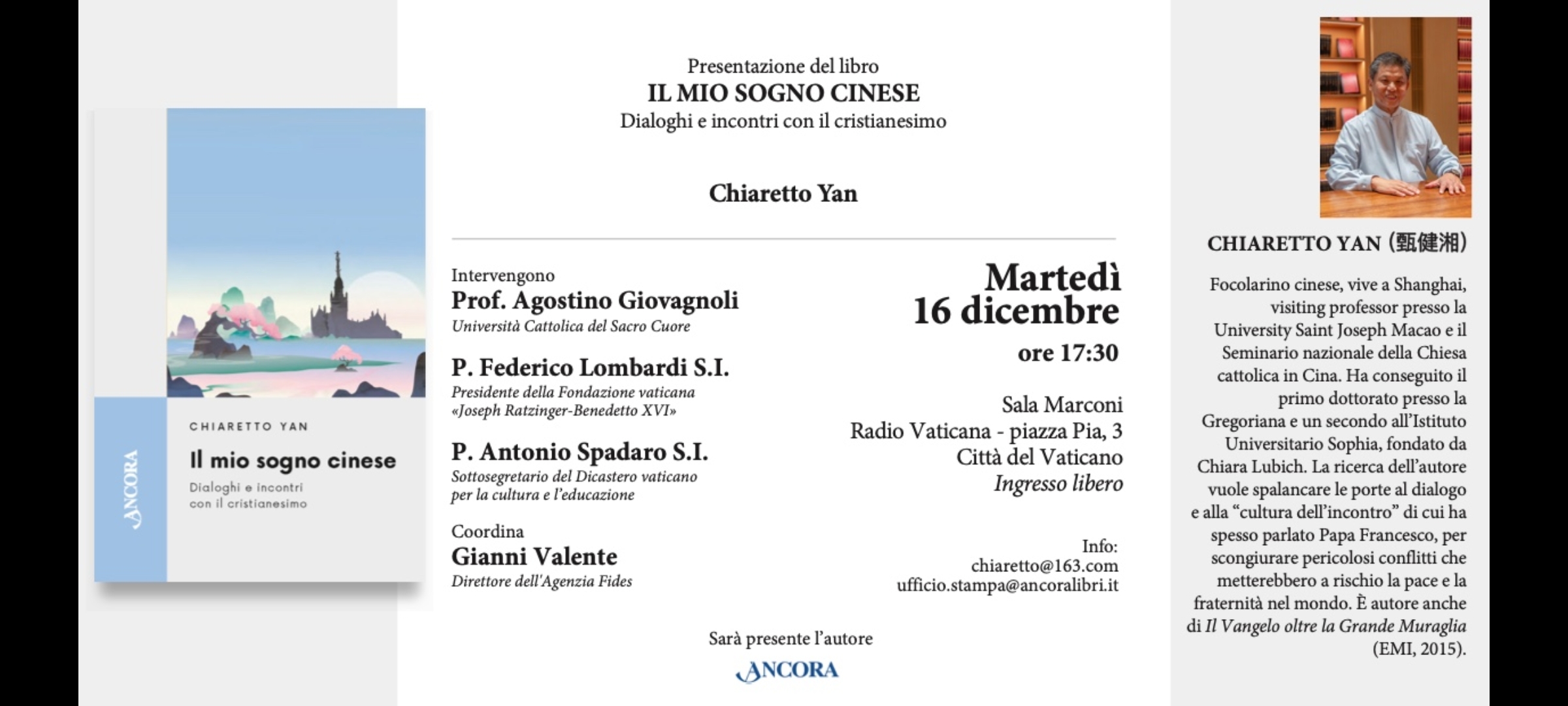 “Spalancare le porte al dialogo e alla cultura dell’incontro di cui ha spesso parlato Papa Francesco, per scongiurare pericolosi conflitti che metterebbero a rischio la pace e la fraternità nel mondo”. E’ questo l’intento che ha spinto Chiaretto Yan, focolarino cinese di Shanghai, visiting professor presso la University Saint Josef di Macao e il Seminario nazionale della Chiesa cattolica in Cina a Pechino, a scrivere “Il mio sogno cinese. Dialoghi e incontri con il cristianesimo”. Il libro sarà presentato domani, 16 dicembre, a Roma con la partecipazione di Agostino Giovagnoli (Università Cattolica del Sacro cuore), padre Federico Lombardi, presidente della Fondazione Joseph Ratzinger-Benedetto XVI, padre Antonio Spadato, sottosegretario del Dicastero vaticano per la cultura e l’educazione. Coordina Gianni valente, direttore dell’agenzia Fides. Il Sir ha incontro l’autore.