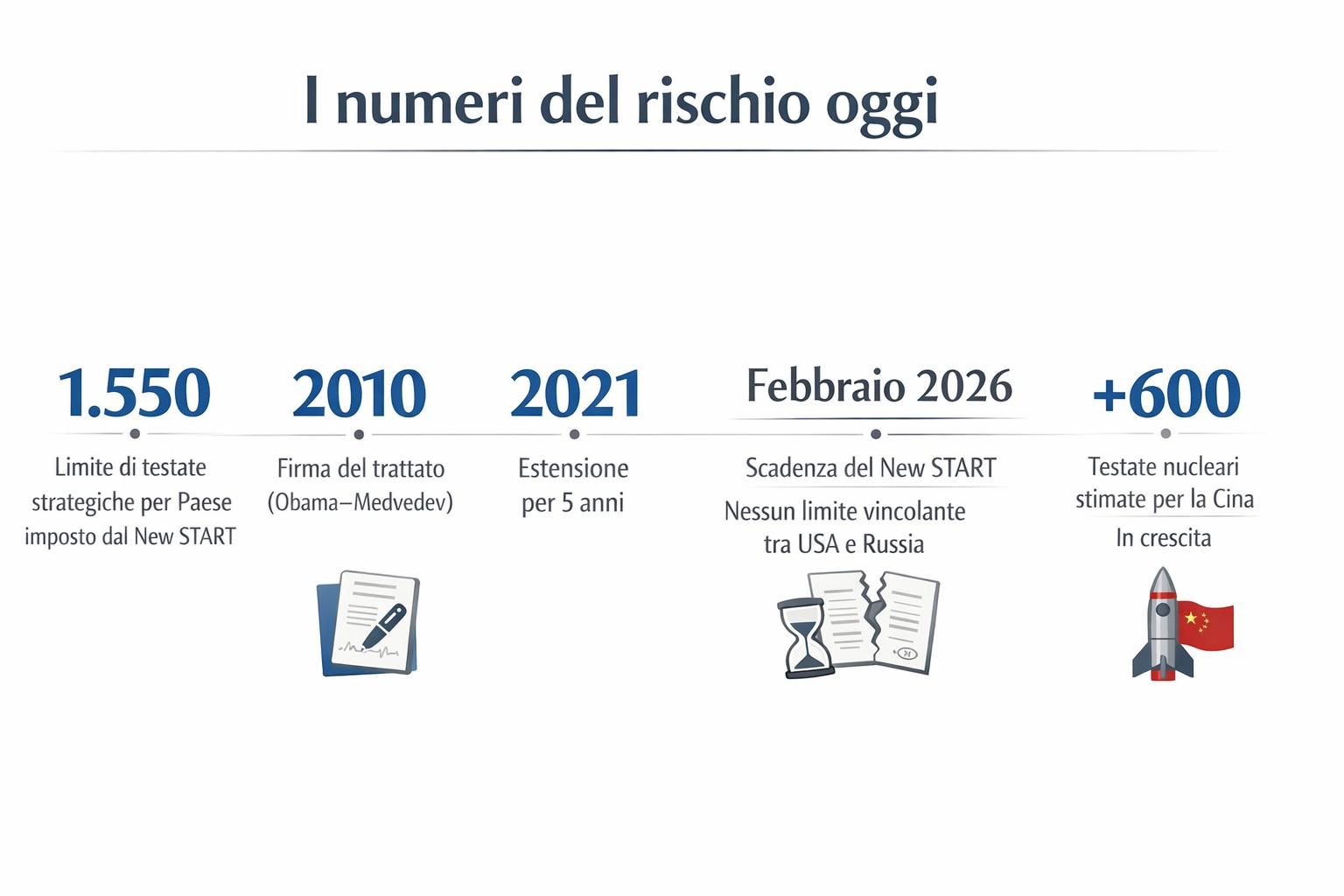 La bomba atomica, esito estremo della ricerca scientifica del Novecento, nasce durante la Seconda guerra mondiale con il Progetto Manhattan e viene impiegata nel 1945 a Hiroshima e Nagasaki. Da allora, come ricostruiscono numerosi studi storici e scientifici, l’arma nucleare ha rappresentato il fulcro della cosiddetta deterrenza: la capacità di distruzione totale ha spinto le potenze a evitare lo scontro diretto, dando origine a un sistema di equilibri fondato sulla paura reciproca. Proprio per contenere questo rischio, durante la Guerra fredda e dopo di essa sono stati siglati numerosi accordi di controllo degli armamenti. Il New Start, firmato nel 2010 a Praga dai presidenti Barack Obama e Dmitrij Medvedev, era l’ultimo di questi strumenti. L’accordo fissava a 1.550 il numero massimo di testate nucleari strategiche schierate per ciascun Paese e prevedeva ispezioni reciproche e scambi di dati, considerati essenziali per la trasparenza e la fiducia. Nel 2021, alla sua prima scadenza, l’amministrazione Biden ne aveva concordato l’estensione per 5 anni.