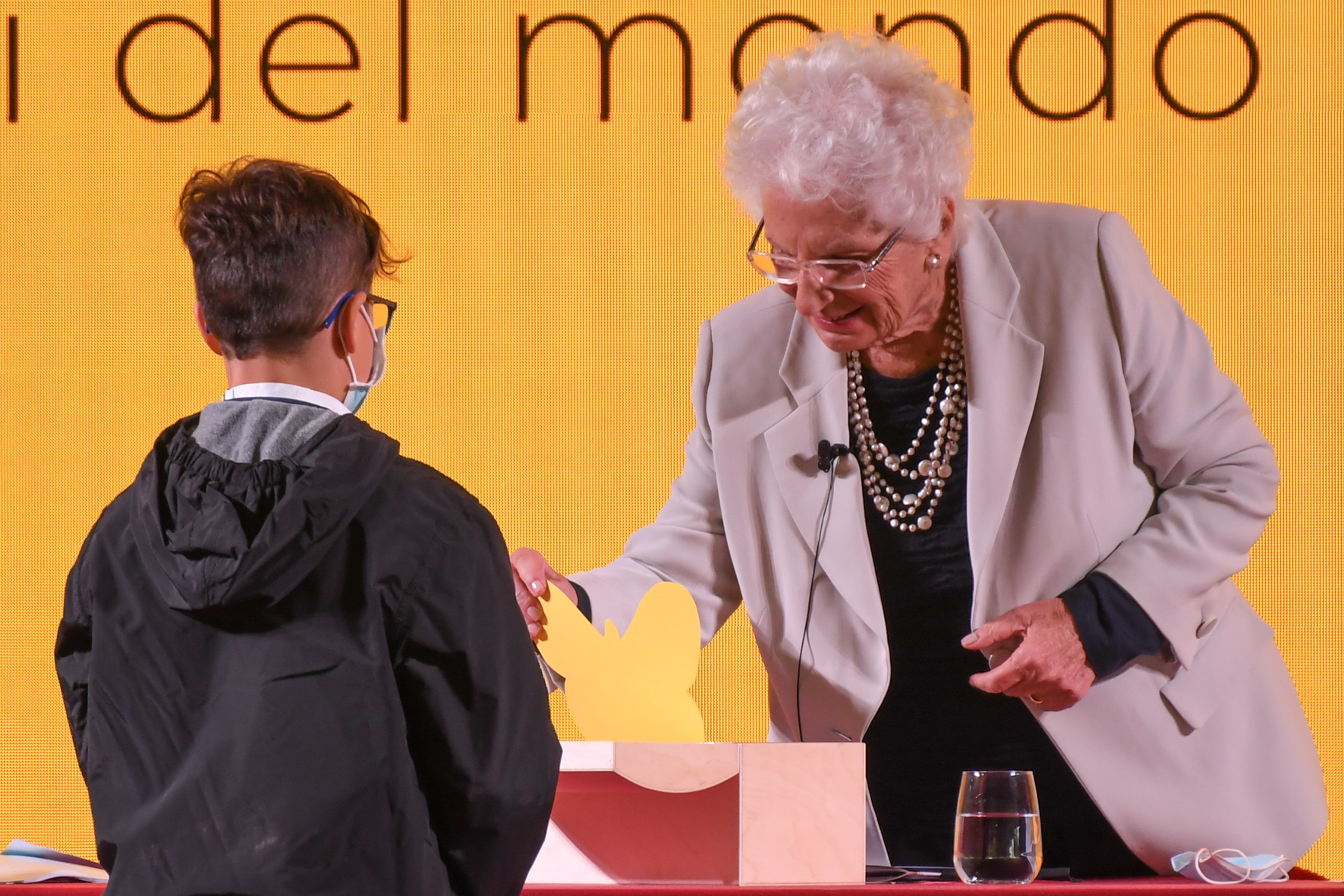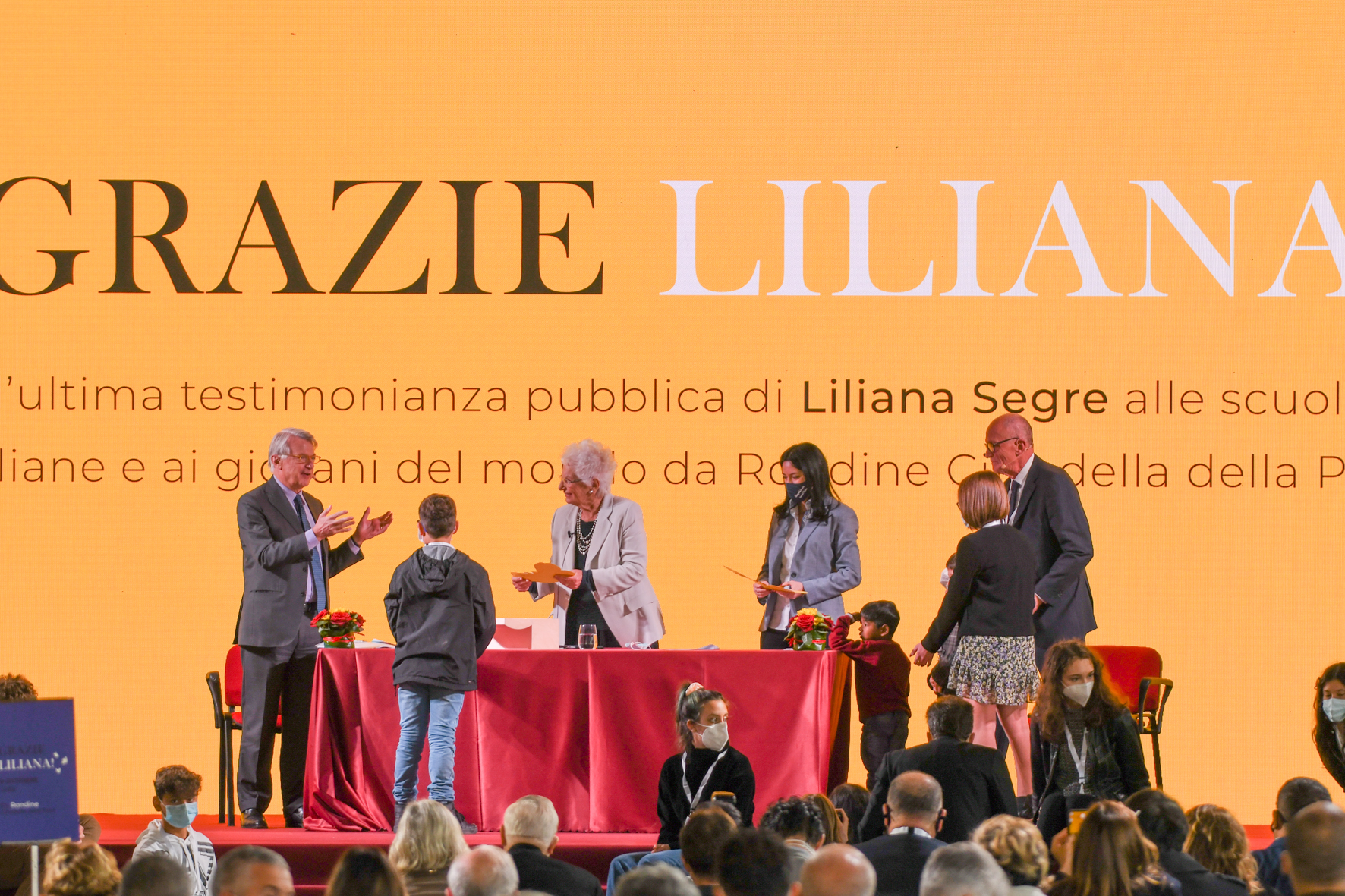 La senatrice ha poi dato lettura di un messaggio del presidente della Repubblica, Sergio Mattarella, indirizzato ai giovani che accompagnava il dono di una copia della Costituzione: “La Costituzione – scrive Mattarella – è stata scritta avendo davanti agli occhi le tragiche vicende che hanno coinvolto anche Liliana Segre da ragazza ed è stata approvata con la ferma determinazione di non permettere che i mostri del totalitarismo e dell’antisemitismo che avevano devastato l’Europa pochi anni prima potessero ancora avvelenare l’Italia, il nostro continente, il mondo”. “Mai più privazione della libertà, mai più guerre di aggressione, mai più negazione dei diritti umani, mai più razzismo, odio, intolleranza. Questa – per Mattarella- era la comune volontà dei Padri costituenti. È merito loro se la nostra Repubblica è fondata su principi di grande valore: democrazia, libertà, uguaglianza, centralità della persona umana, pace e giustizia tra le Nazioni. A voi viene affidato per il futuro questo patrimonio”.