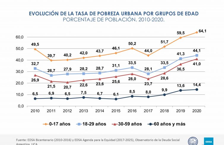 16 minori su 100 sono in situazione di povertà estrema (erano poco meno di 15 un anno fa) e 64 vivono sotto la soglia di povertà (59,5% nel 2019) nelle grandi e medie zone urbane dell’Argentina (erano poco meno di 15 un anno fa). Lo denuncia il rapporto annuale dell’Osservatorio del deficit sociale dell’Università Cattolica Argentina, intitolato “Deficit sociale in Argentina 2010-2020. Crisi occupazionale, povertà e disuguaglianze strutturali nel contesto del Covid-19. Contributi per un’agenda sostenibile per lo sviluppo umano integrale”. Lo studio, oltre ai dati complessivi, prende in esame il tasso di povertà e di indigenza della popolazione urbana argentina, distinguendo tra zone geografiche, età, situazione occupazionale.