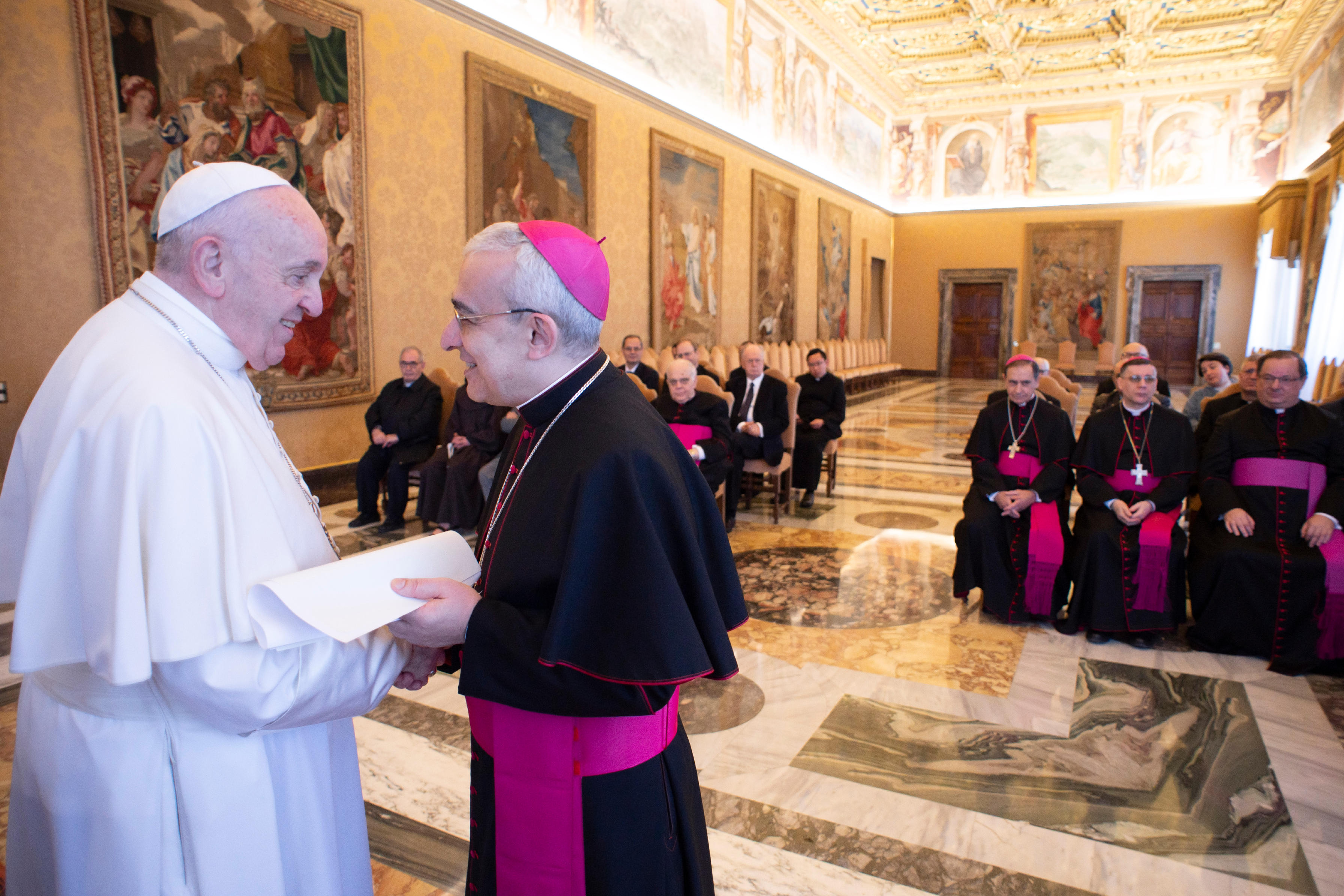 “È necessario riacquisire e approfondire il senso vero del diritto nella Chiesa, corpo mistico di Cristo, dove la preminenza è della Parola di Dio e dei Sacramenti, mentre la norma giuridica ha un ruolo necessario, ma subordinato e al servizio della comunione”. Lo ha detto il Papa, ricevendo in udienza i partecipanti alla plenaria del Pontificio Consiglio per i testi legislativi, il cui compito – ha spiegato Francesco – consiste nel favorire “una genuina formazione giuridica nella Chiesa, che faccia comprendere la pastoralità del diritto canonico, la sua strumentalità in ordine alla salus animarum (can. 1752), la sua necessità per ossequio alla virtù della giustizia, che sempre deve essere affermata e garantita”. In questa prospettiva, Francesco ha definito “quanto mai attuale” l’invito di Benedetto XVI, rivolto ai seminaristi ma valido per tutti i fedeli: “Imparate anche a comprendere e – oso dire – ad amare il diritto canonico nella sua necessità intrinseca e nelle forme della sua applicazione pratica: una società senza diritto sarebbe una società priva di diritti”. “Far conoscere e applicare le leggi della Chiesa non è un intralcio alla presunta ‘efficacia’ pastorale di chi vuol risolvere i problemi senza il diritto – ha precisato il Papa – bensì garanzia della ricerca di soluzioni non arbitrarie, ma veramente giuste e, perciò, veramente pastorali. Evitando soluzioni arbitrarie, il diritto diventa valido baluardo a difesa degli ultimi e dei poveri, scudo protettore di chi rischia di cadere vittima dei potenti di turno”. “Noi vediamo oggi in questo contesto di guerra mondiale a pezzetti, vediamo come sempre c’è la mancanza del diritto, sempre. Le dittature – ha ammonito Francesco – nascono e crescono senza diritto. Nella Chiesa non può succedere questo”.