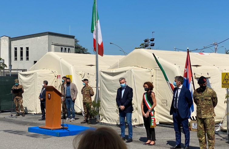 Si è svolta questa mattina a Crema la cerimonia di ammainabandiera per la chiusura dell’Ospedale da campo, resosi necessario per affrontare l’emergenza sanitaria causata dalla pandemia di coronavirus Covid-19. “Questa è un’esperienza che vi cambierà e ci cambierà per sempre. Siamo un Paese che vuole superare questa difficile prova e sappiamo di poterlo fare anche grazie al lavoro di tutti voi. Solidarietà, professionalità e generosità hanno aiutato anche questa città a rialzarsi e guardare al futuro con speranza”, sono state le parole del ministro della Difesa Lorenzo Guerini, riportate sul sito istituzionale, alla presenza di autorità civili, religiose e militari. Il ministro Guerini ha ringraziato i medici e gli infermieri della Brigata cubana, i primi ad arrivare e gli ultimi ad andare via dall’Italia, dimostrando solida amicizia e grande solidarietà. “La Difesa ha messo in campo tutte le sue forze e capacità in una fase di grave criticità per il Paese e sta continuando il suo determinante supporto anche nella Fase 2”, ha dichiarato Guerini che può contare sul personale del 3° Reparto sanità dell’Esercito, capace di realizzare un Ospedale da campo in sole 72, simbolo di un giuramento alla Bandiera, che non è un atto retorico ma un impegno verso il Paese, le Istituzioni e i cittadini. “Tutti i medici e i professionisti che hanno coordinato l’Unità di crisi, gli infermieri, gli operatori sanitari, i nostri militari, il personale della Protezione civile hanno fatto un eccezionale lavoro di squadra”.