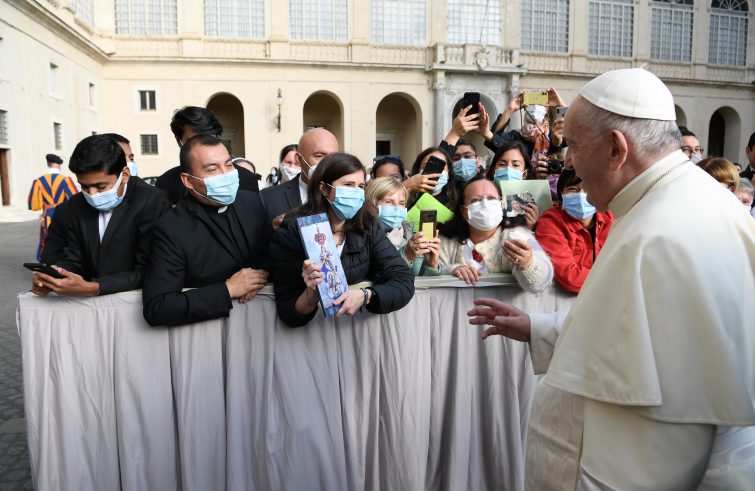 Il Papa è arrivato al Cortile di San Damaso, dove lo hanno accolto circa 500 fedeli nel rispetto delle norme di sicurezza e di distanziamento sociale, poco dopo le 9. Nel percorso a piedi lungo le transenne, che come di consueto durante l’udienza del mercoledì precede la catechesi, ha benedetto foto, rosari, libri, oggetti e immagini, firmandone qualcuna, e si è soffermato a parlare con un gruppo di ragazzi americani, riconoscibili dalla grande bandiera a stelle e strisce adagiata sulla transenna. Non è mancato lo scambio dello zucchetto e l’incontro, sempre a debita distanza, con alcune giovani famiglie con bambini, ai quali Francesco si è rivolto per dire qualche parola. “Oggi è il compleanno di mia madre, può fargli gli auguri?”, il testo di un biglietto scritto in spagnolo che una donna gli ha consegnato. Altre donne, lungo il tragitto, gli hanno mostrato foto dei loro cari sul telefonino, che il Santo Padre ha benedetto.