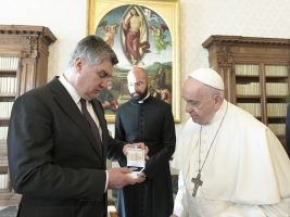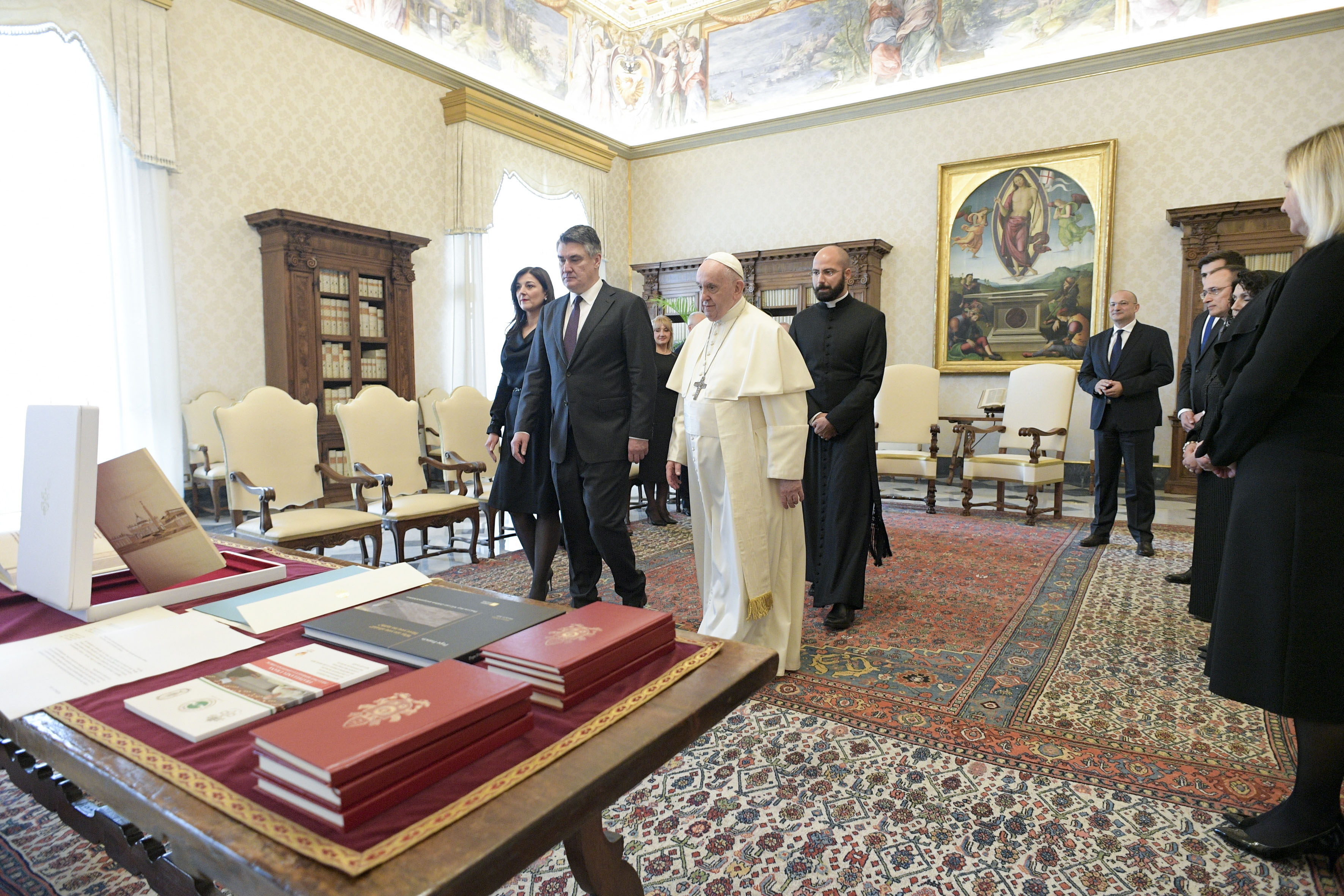 esistenti e l’intenzione di sviluppare ulteriormente la collaborazione”. Inoltre, si legge ancora nel comunicato, “si è parlato di diverse tematiche di carattere internazionale e regionale, tra le quali la situazione del popolo croato in Bosnia ed Erzegovina”. Il Papa ha donato al presidente croato un mosaico raffigurante il lavoro per la raccolta dell’uva, oltre ai consueti volumi dei documenti papali, al Messaggio per la Pace di quest’anno, al Documento sulla fratellanza umana e al volume della Libreria editrice vaticana sulla Statio Orbis del 27 marzo 2020. Il presidente croato ha donato al Santo Padre una copia fotostatica del Messale del Duca Novak, risalente al 14° secolo.