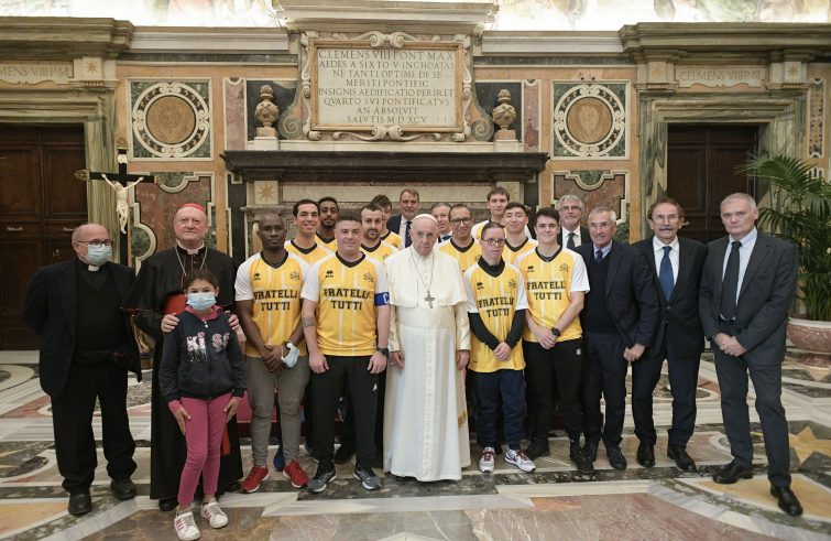 “Vi auguro una buona partita. Non importa chi farà più gol, perché il gol decisivo lo fate insieme, il gol che fa vincere la speranza e che dà un calcio all’esclusione. Grazie a tutti!”. È il “saluto” che Papa Francesco ha rivolto questa mattina ai partecipanti alla partita amichevole di calcio “Fratelli tutti”, che si terrà domani, domenica 21 novembre, tra la “World Rom Organization” e la “Squadra del Papa – Fratelli tutti”, organizzata dal Pontificio Consiglio della cultura. Un’iniziativa promossa per raccogliere i fondi per sostenere il progetto “Un calcio all’esclusione”, avviato dalla diocesi di Roma per favorire l’inclusione dei Rom e delle persone più fragili. Della “squadra del Papa” fanno parte qualche Guardia Svizzera, sacerdoti che lavorano in uffici della Curia romana, dipendenti vaticani e alcuni loro figli. In campo – con la maglietta che porta la scritta “Fratelli tutti” – ci saranno anche un giovane calciatore con la sindrome di Down, appartenente a “Special Olympics”, e tre migranti. “Questi – ha ricordato Francesco -, dopo un percorso segnato da soprusi e violenze, che li ha visti passare dal campo greco di Lesbo e poi in Italia, sono stati accolti dalla Comunità di Sant’Egidio e stanno vivendo un’esperienza di integrazione”. “Grazie a tutti per aver accettato di far parte della ‘squadra del Papa’!”, ha detto Francesco. “È una squadra dove non ci sono barriere e che fa dell’inclusione la semplice normalità”.