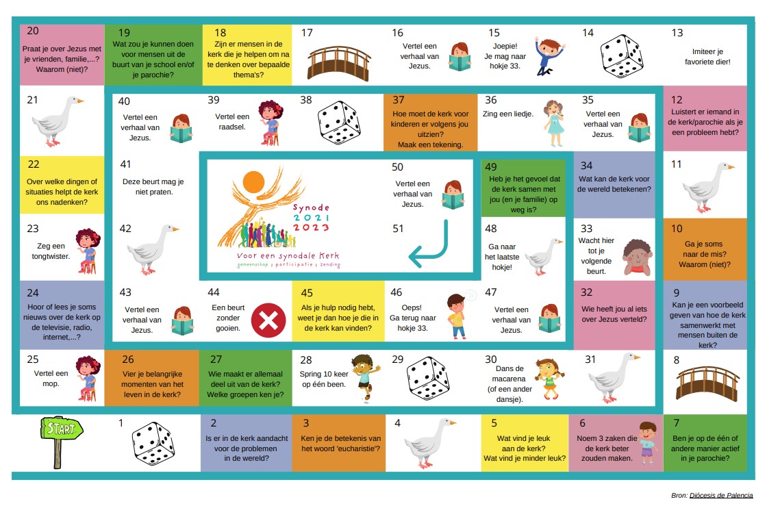 Per coinvolgere i bambini nel cammino del Sinodo basta un gioco dell’oca: lo ha pensato la diocesi spagnola di Palencia che sul suo sito ha preparato un’attività per raccogliere le osservazioni e le opinioni anche dai più piccoli. La proposta ruota attorno a un percorso di 52 caselle, divise per colore e una serie di domande e indicazioni, per arrivare alla casella finale del Sinodo. Se tirando i dadi si capita su una casella rosa, “ascoltare e prendere la parola”, bisogna rispondere alle domande o compiti del tipo: “elenca 3 proposte che faresti alla Chiesa, per migliorarla” oppure “C’è qualcuno in parrocchia che ti ascolta quando hai bisogno di dire qualcosa che ti preoccupa?” “Quando parli di Gesù, cosa ti dicono gli altri?”. Se invece di finisce sull’arancio, il filo conduttore è “celebrare la fede e la vita” con domande e sollecitazioni attorno all’eucarestia, a cui bisogna rispondere prima di tirare di nuovo i dadi (perché vai a messa la domenica? Inviteresti tuoi amici alla messa? Che cosa ti direbbero? Disegna una chiesa a misura di bambino). Le caselle verdi sono dedicate al “partecipare e condividere le responsabilità” (come partecipi in parrocchia? cosa potremmo fare noi bambini affinché, nel quartiere le persone siano felici. Elenca quanti gruppi conosci che fanno parte della Chiesa…). Le caselle blu invece invitano a pensare al dialogo nella Chiesa e con la società; il giallo “discernere e decidere”. I cinque blocchi (ascoltare, celebrare, partecipare, dialogare, discernere), sono gli stessi su cui ruotano i materiali per giovani e adulti. Della tavola del gioco dell’oca ne esiste già una versione in olandese, sul sito diocesi di Haarlem Amsterdam.