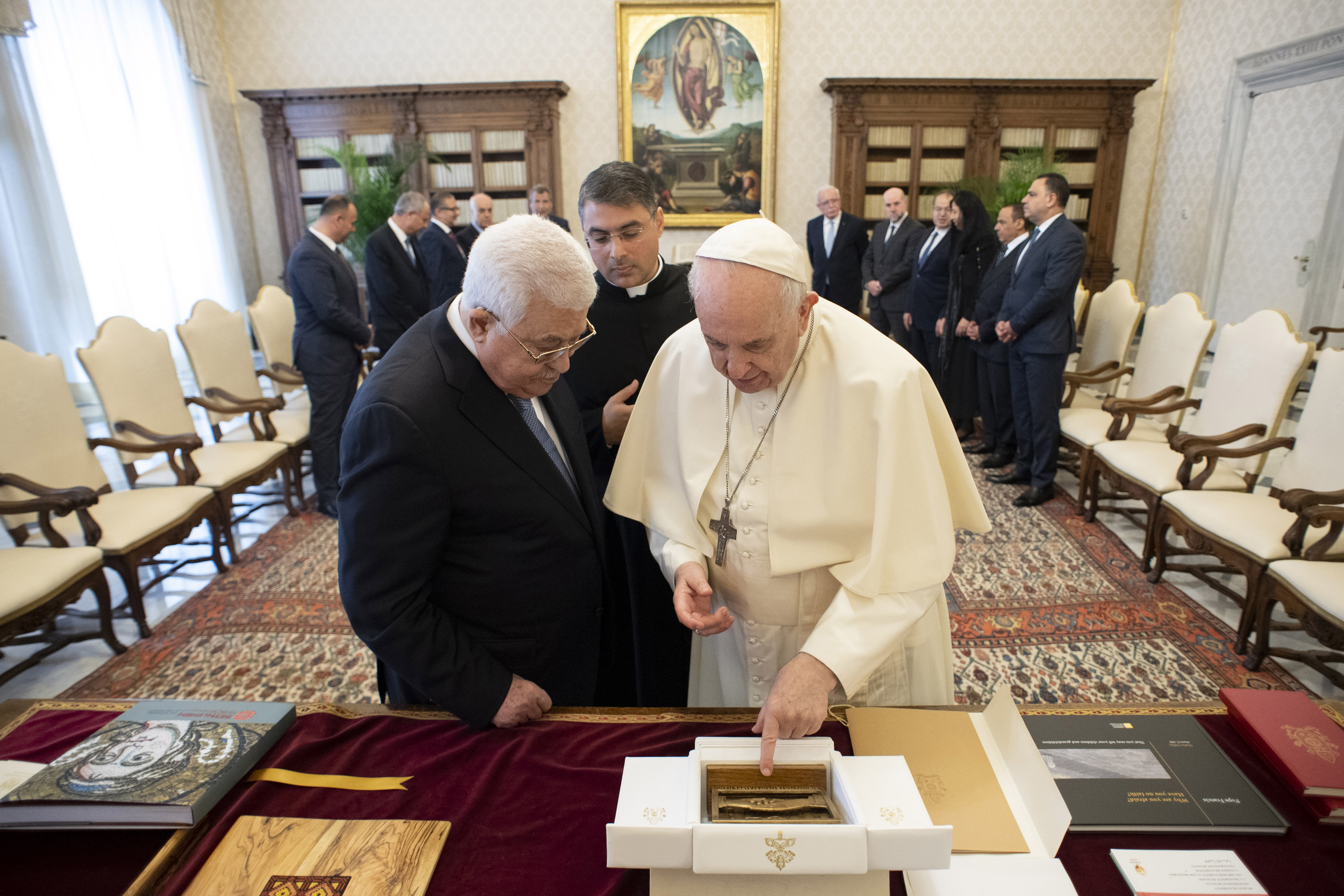 È durato circa 50 minuti il colloquio privato tra il Papa e il presidente dello Stato di Palestina, Mahmud Abbas, il quale ha incontrato successivamente il cardinale segretario di Stato, Pietro Parolin, accompagnato da mons. Paul Richard Gallagher, segretario per i Rapporti con gli Stati. “Nel corso dei cordiali colloqui in Segreteria di Stato – riferisce la Sala Stampa della Santa Sede – sono stati riconosciuti i buoni rapporti tra la Santa Sede e lo Stato di Palestina, e si sono affrontate questioni bilaterali di mutuo interesse”. Inoltre, “si è riconosciuta la necessità di promuovere la fratellanza umana e la convivenza pacifica tra le varie fedi”. Circa il processo di pace tra israeliani e palestinesi, “ci si è soffermati sulla assoluta necessità di riattivare il dialogo diretto per raggiungere la soluzione dei due Stati, anche con l’aiuto di un più vigoroso impegno della comunità internazionale”. Quanto allo status di Gerusalemme, “si è ribadito che debba essere riconosciuta da tutti come luogo d’incontro e non di conflitto, e come il suo status debba preservare l’identità e il valore universale di Città santa per tutte e tre le religioni abramitiche, anche attraverso uno statuto speciale internazionalmente garantito”. Infine, “si è parlato dell’urgenza di lavorare per la pace, evitando l’uso delle armi, e combattendo ogni forma di estremismo e di fondamentalismo”. Il Papa – oltre ai volumi dei documenti papali, al Messaggio per la pace di quest’anno, al Documento sulla Fratellanza umana e al libro sulla Statio Orbis del 27 marzo 202° a cura della Libreria Editrice Vaticana, omaggi abituali ai capi di Stato – ha donato al presidente palestinese una fusione in bronzo raffigurante due mani che si stringono, sullo sfondo del colonnato di San Pietro, con una donna con bambino e una nave di migranti e la scritta “Riempiamo le mani di altre mani”.  Abbas ha donato invece al Santo padre un libro sulla basilica della Natività, a Betlemme, e una rappresentazione della grotta della Natività in ambra.