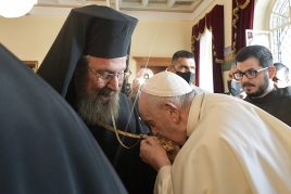 Per quanto riguarda la visita di Papa Francesco a Cipro e in Grecia, il custode si è detto particolarmente colpito dal Pontefice e dall’arcivescovo greco ortodosso Chrysostomos II, che insieme ammiravano un evangeliario, completamente scritto a mano e miniato da un monaco greco di Cipro che ha impiegato 5 anni per farlo. “Vedere la gioia dei due davanti a questa opera che contiene la Parola che unisce – spiega padre Patton – mi ha ricordato ciò che spesso il Papa ha ripetuto in questo viaggio: nel procedere insieme e nel cammino ci vuole molta pazienza”. Altro momento significativo “è stato allo stadio di Nicosia. Papa Francesco ha richiamato l’immagine della perla. Questa è il prodotto del dolore, risultato dell’entrata all’interno dell’ostrica di una sostanza estranea o indesiderata. Dalla sofferenza scaturisce qualcosa di prezioso. Questa immagine – per il custode – ci aiuta a scoprire il valore di saper trasformare le situazioni difficili in qualcosa di ‘pasquale’”. Infine, nella chiesa parrocchiale di Santa Croce a Nicosia, l’incontro con 4 rifugiati di varie parti del mondo che hanno offerto la loro testimonianza. Epilogo cipriota della visita papale. “Sono rimasto colpito dal modo in cui Papa Francesco ha accolto questi rifugiati ribadendo loro che sono il presente e il futuro della Chiesa. Il Papa ci ha esortato in tal modo a superare la logica del filo spinato per arrivare a quella dell’accoglienza fraterna. Ho potuto sperimentare personalmente questo invito andando a celebrare – il giorno dopo la partenza del Papa per la Grecia – nel campo di prima accoglienza di Pournara, a ovest di Nicosia, non distante dalla linea di confine con l’autoproclamata Repubblica turca di Cipro Nord”. Accompagnato da padre Andrew Arhin, parroco della parrocchia latina di Santa Croce a Nicosia, il custode rivela di essere stato “testimone della gioia che traspariva dal volto di alcuni giovani nigeriani e congolesi mentre celebravamo dentro una cappella dismessa, in un campo completamente circondato dal filo spinato. In quel momento ho visto l’ossimoro della libertà cristiana: si può essere circondati da filo spinato, ma se veramente credi e celebri l’Eucarestia senti di essere libero, di essere una persona con una dignità ed un futuro. Mi ha colpito la loro gioia durante la celebrazione. Poche volte ho visto scene simili specie in luoghi dove si può celebrare in ambienti confortevoli”.