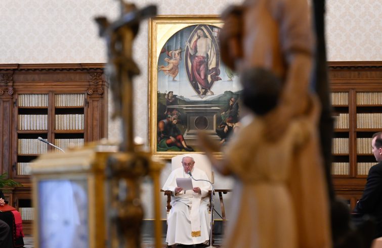 “La Messa non può essere solo ascoltata – è anche un’espressione non giusta, ‘io vado ad ascoltare la messa’ – come se noi fossimo solo spettatori di qualcosa che scivola via senza coinvolgerci”. È il monito del Papa, che nella parte finale dell’udienza di oggi, trasmessa in diretta streaming dalla biblioteca privata del Palazzo apostolico e dedicata alla preghiera nella liturgia, ha ricordato che “la Messa è sempre celebrata, e non solo dal sacerdote che la presiede, ma da tutti i cristiani che la vivono. E il centro è Cristo. Tutti noi, nella diversità dei doni e dei ministeri, tutti ci uniamo alla sua azione, perché lui, Cristo, è il protagonista della liturgia”. “Quando i primi cristiani iniziarono a vivere il loro culto, lo fecero attualizzando i gesti e le parole di Gesù, con la luce e la forza dello Spirito Santo, affinché la loro vita, raggiunta da quella grazia, diventasse sacrificio spirituale offerto a Dio”, ha sottolineato Francesco, secondo il quale “questo approccio fu una vera rivoluzione”, come scrive San Paolo nella Lettera ai Romani. “La vita è chiamata a diventare culto a Dio, ma questo non può avvenire senza la preghiera, specialmente senza la preghiera liturgica”, l’appello del Papa. “Questo pensiero ci aiuti tutti”, ha proseguito a braccio: “Quando si va a Messa la domenica, vado a pregare in comunità, vado a pregare con Cristo, che è presente. Quando andiamo alla celebrazione di un battesimo, per esempio, il Cristo è lì, è presente che battezza. ‘Ma, padre, questa è un’idea, un modo di dire’. No, non è un modo di dire: Cristo è presente, e con la liturgia tu preghi con Cristo accanto a te”.