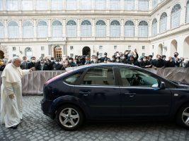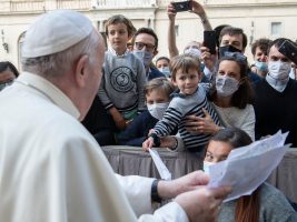 Papa Francesco è arrivato intorno alle 9, a piedi, nel Cortile di San Damaso, dove sono riprese le udienze del mercoledì in presenza, grazie all’allentamento delle misure restrittive imposte dall’emergenza Coronavirus. Francesco è apparso particolarmente sorridente e rilassato, e si è fermato a più riprese a conversare con i fedeli che hanno trovato posto dietro le transenne. “Viva il Papa!”, il saluto festoso dei partecipanti all’udienza, tutti muniti di mascherina. Tra di essi, anche alcuni giovani sacerdoti e un gruppo di suore. C’è anche chi ha chiesto un autografo al Papa per il suo libro “Ritorniamo a sognare”, e alcuni giovani che hanno chiesto di essere benedetti. Un gruppo di suore ha offerto al Santo Padre tre rose bianche a gambo lungo, che lui ha accettato volentieri scambiando qualche battuta con loro. Al posto dello zucchetto, un sacerdote indiano gli ha offerto un copricapo rosso a fantasia, che il Papa ha indossato per un momento restituendolo poi al suo interlocutore. Poi l’ormai tradizionale scambio dello zucchetto, con alcuni fedeli che hanno trovato posto dal lato opposto delle transenne. Infine un colloquio dai toni spiritosi con una donna anziana e uno scambio con un gruppo di giovani. Non sono mancati, tra i partecipanti, anche i bambini molto piccoli, che Francesco ha salutato e accarezzato. Il momento “a tu per tu” con i fedeli è durato circa un quarto d’ora, prima che il Papa prendesse posto nella sua postazione al centro del cortile, per introdurre l’udienza.