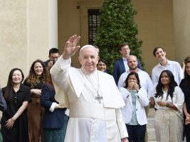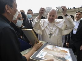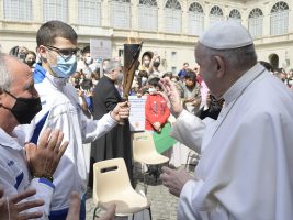 Papa Francesco è arrivato intorno alle 9 nel Cortile di San Damaso, dove è stato accolto calorosamente dai fedeli che intonavano in coro: “W il Papa!”. Sceso dalla macchina, Francesco si è intrattenuto a lungo a conversare con i presenti, radunati intorno alle transenne che fanno da perimetro alla zona del Cortile adibita ad accogliere i partecipanti all’udienza, chiacchierando in particolare con i gruppi di giovani e firmando autografi sugli oggetti più disparati: foto, lettere, disegni, rosari, immaginette, fotografie, libri, bandiere variopinte. Chiacchierando amabilmente con una famiglia, Francesco ha scherzato soprattutto con un bimbo in braccio al suo papà, un po’ timido per l’incontro così importante a cui ha partecipato. Non è mancato l’ormai tradizionale scambio dello zucchetto, insieme con i selfie. Tra i doni ricevuti, anche una voluminosa borsa della spesa in plastica bianca, verosimilmente contenente generi di conforto da dare ai più poveri. Sorridente e rilassato, il Papa sembrava non volersi staccarsi più dalla piccola folla di fedeli, con cui si è intrattenuto circa mezz’ora.