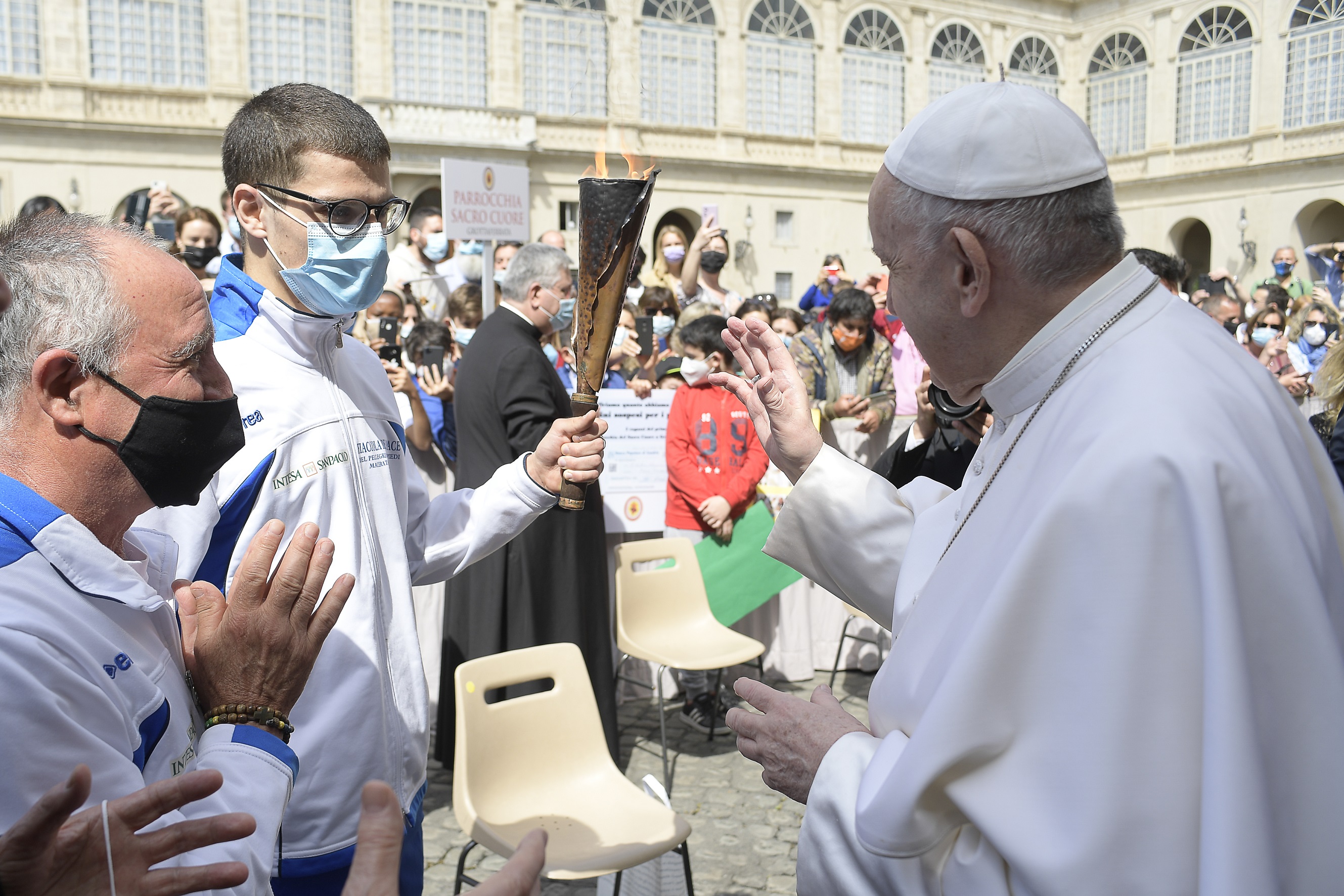 Papa Francesco è arrivato intorno alle 9 nel Cortile di San Damaso, dove è stato accolto calorosamente dai fedeli che intonavano in coro: “W il Papa!”. Sceso dalla macchina, Francesco si è intrattenuto a lungo a conversare con i presenti, radunati intorno alle transenne che fanno da perimetro alla zona del Cortile adibita ad accogliere i partecipanti all’udienza, chiacchierando in particolare con i gruppi di giovani e firmando autografi sugli oggetti più disparati: foto, lettere, disegni, rosari, immaginette, fotografie, libri, bandiere variopinte. Chiacchierando amabilmente con una famiglia, Francesco ha scherzato soprattutto con un bimbo in braccio al suo papà, un po’ timido per l’incontro così importante a cui ha partecipato. Non è mancato l’ormai tradizionale scambio dello zucchetto, insieme con i selfie. Tra i doni ricevuti, anche una voluminosa borsa della spesa in plastica bianca, verosimilmente contenente generi di conforto da dare ai più poveri. Sorridente e rilassato, il Papa sembrava non volersi staccarsi più dalla piccola folla di fedeli, con cui si è intrattenuto circa mezz’ora.