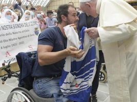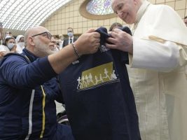 A Francesco è stata donata la t-shirt solidale di Athletica Vaticana, evidenziando l’immagine inclusiva: l’atleta in sedia a rotelle e la scritta We Run Together (Simul currebant in latino). Il primo obiettivo dell’associazione sportiva ufficiale vaticana, conclude il comunicato, “è contribuire a cambiare la mentalità della percezione della disabilità favorendo in ogni modo l’inclusione”.