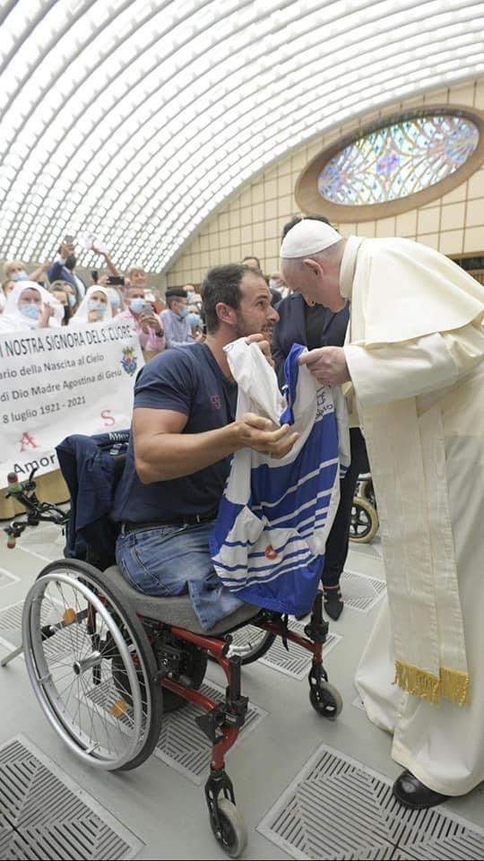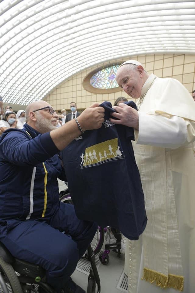 A Francesco è stata donata la t-shirt solidale di Athletica Vaticana, evidenziando l’immagine inclusiva: l’atleta in sedia a rotelle e la scritta We Run Together (Simul currebant in latino). Il primo obiettivo dell’associazione sportiva ufficiale vaticana, conclude il comunicato, “è contribuire a cambiare la mentalità della percezione della disabilità favorendo in ogni modo l’inclusione”.